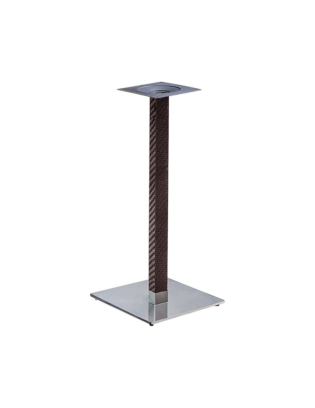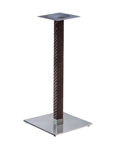 Base de mesa alta con pie central, columna revestida de similpiel, Base de 45 x 45 cms. de 8 mm. de espesor cubierta de acero inoxidable. Para uso en interiores. Mesa de altura 72 cms a juego