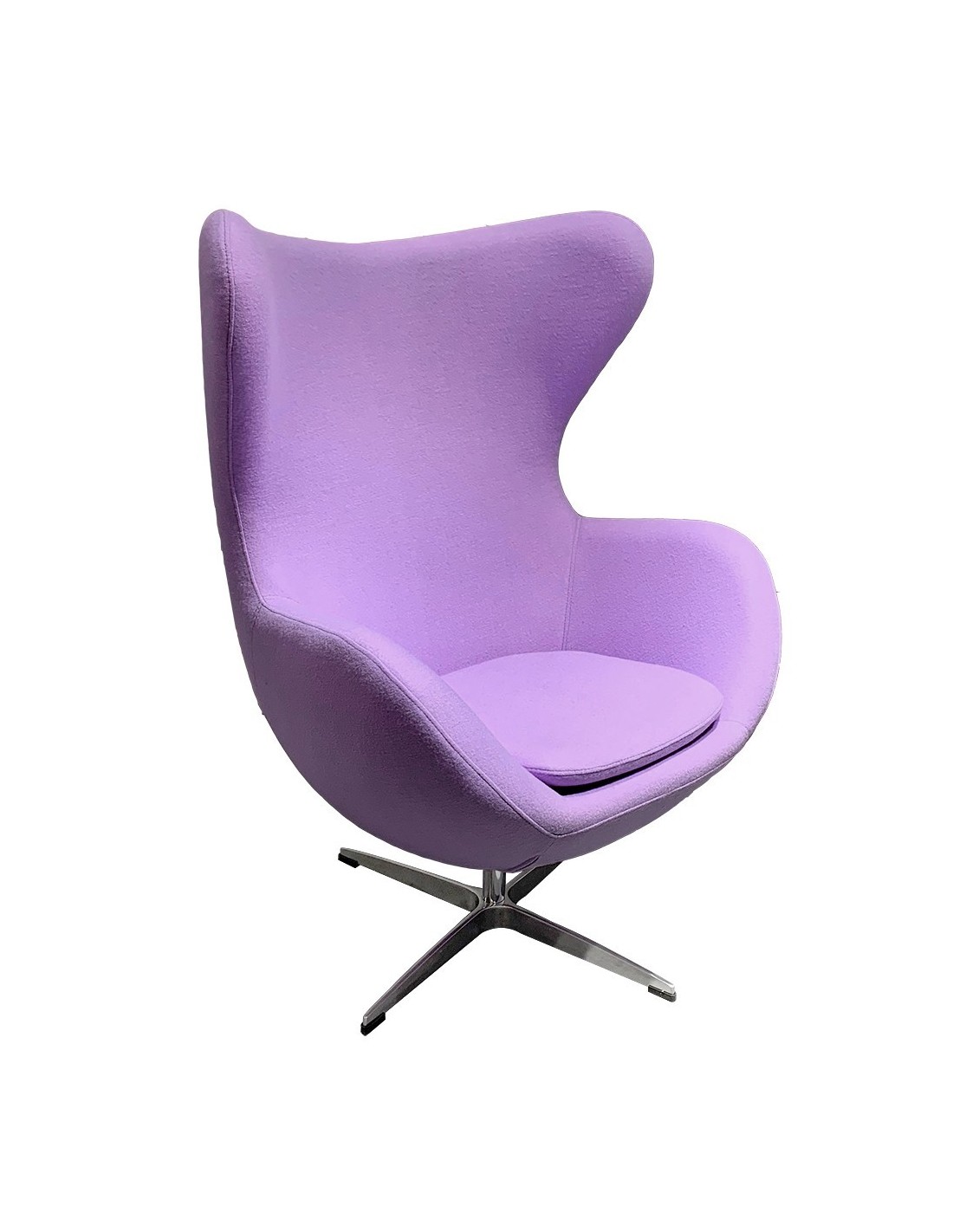 Sillón de diseño, giratorio, base y columna cromada, tapizado en tejido cachemira lila. Otros colores disponibles.