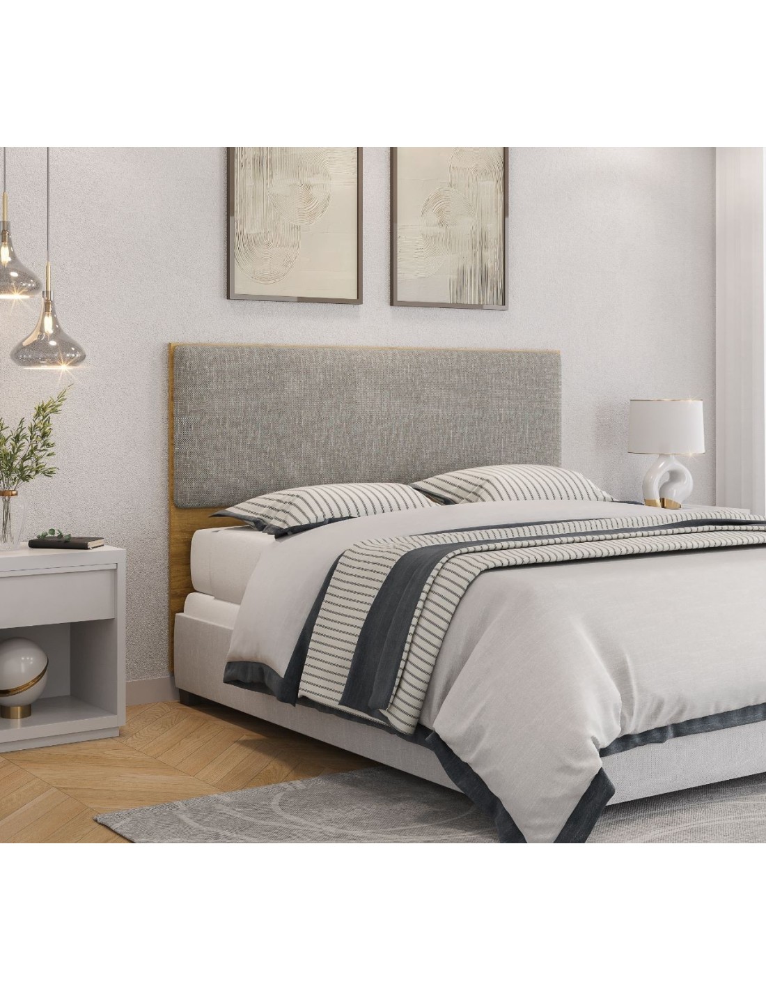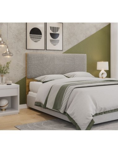 Cabecero de diseño, MDP blanco, tapizado en tejido chumbo. Otros acabados disponibles.