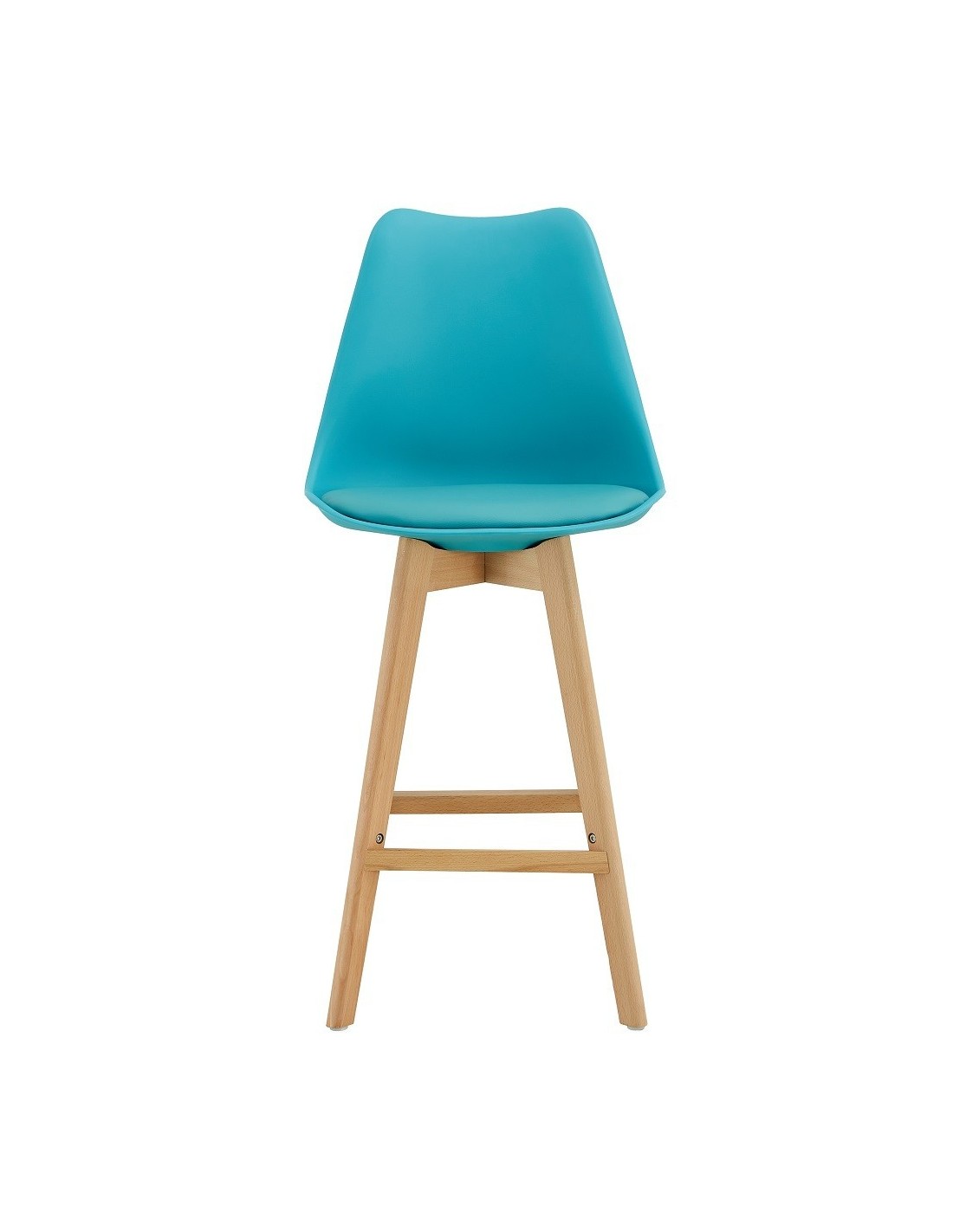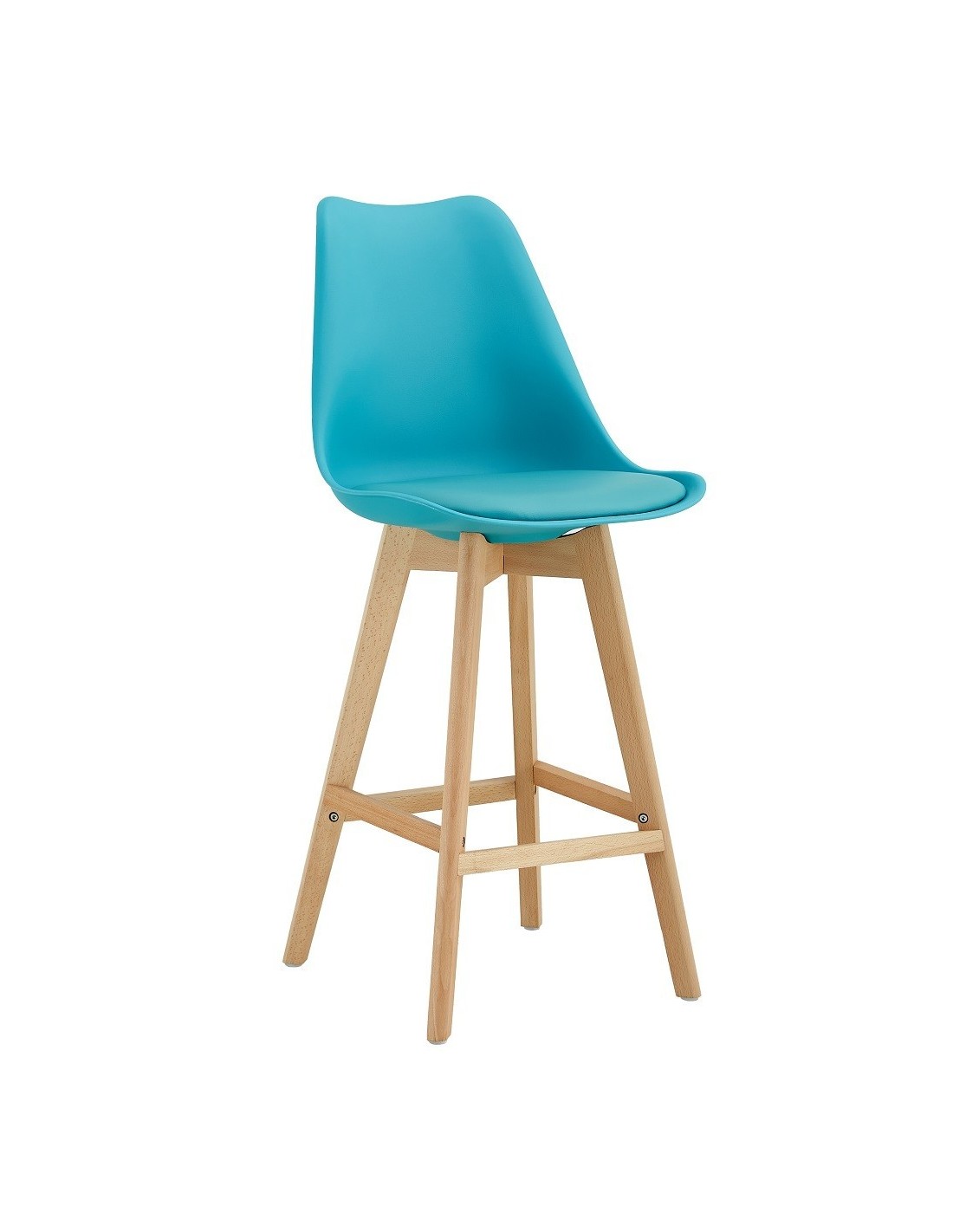 Taburete de diseño, madera, carcasa turquesa, cojín turquesa. Sillas y sillones a juego. Altura asiento 72 cms