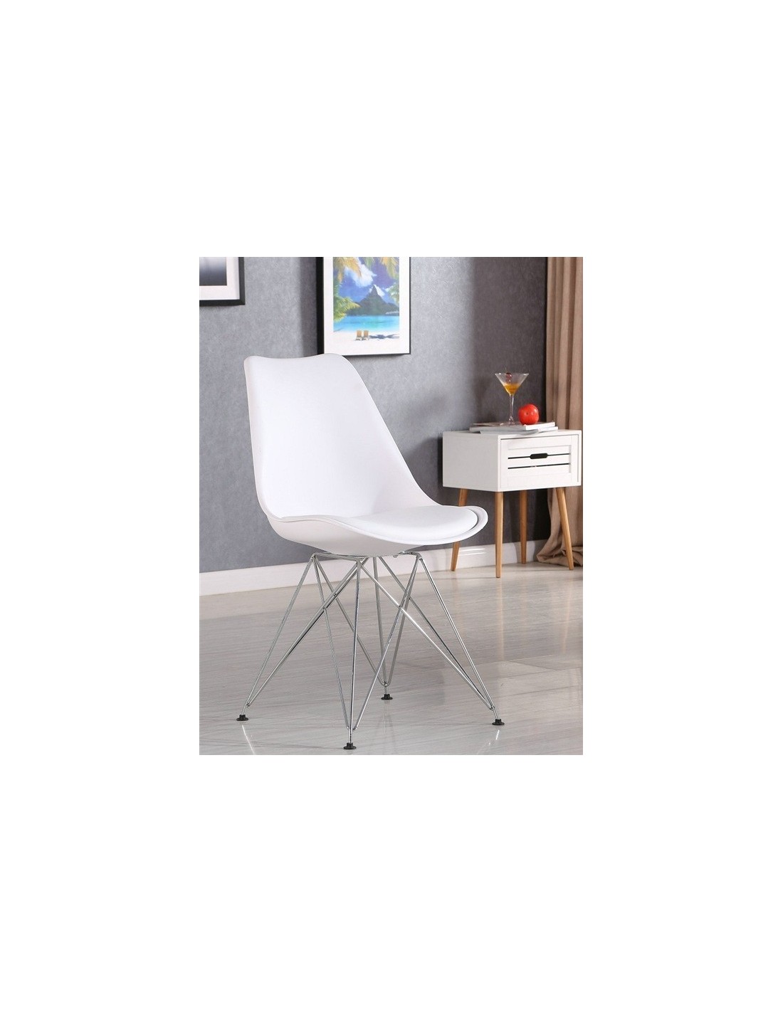 Silla de diseño, cromada, carcasa y cojín de asiento en similpiel blanca. Otros colores disponibles.