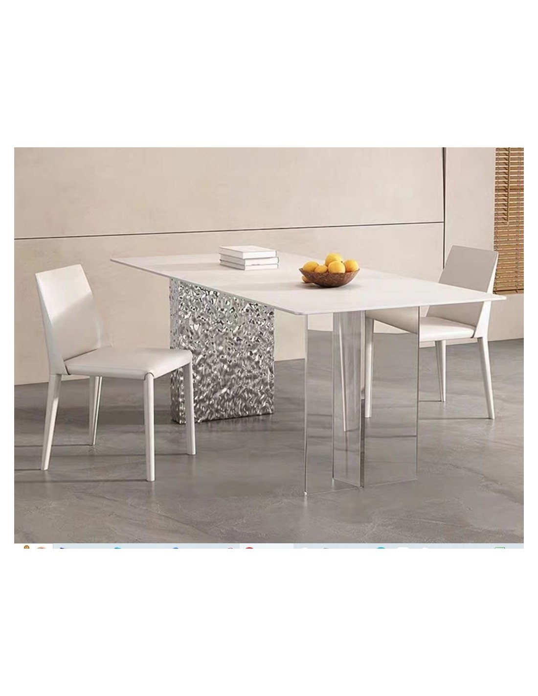 Mesa de comedor, base de acero inoxidable y acrílica, tapa de cerámica con acabado mármol blanco mate