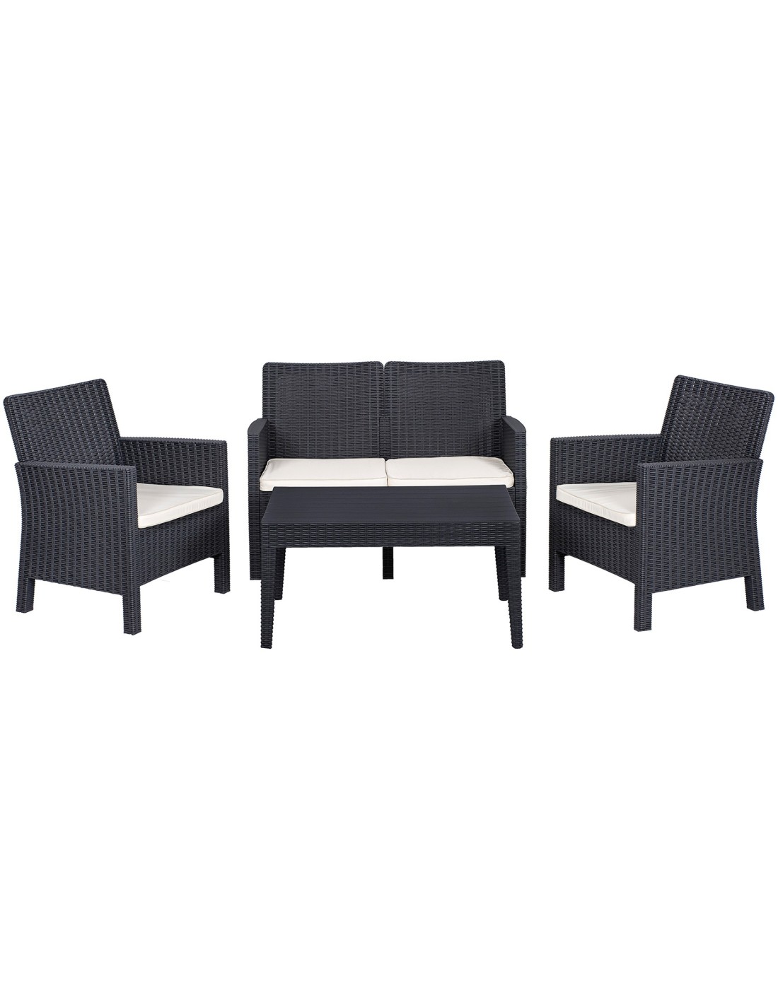 Set compuesto de: 2 unidades de Sillón, 1 unidad de Sofá de 2 plazas y una unidad de mesa baja, 100 % polipropileno color antracita. Cojines incluidos. Uso exterior e interior