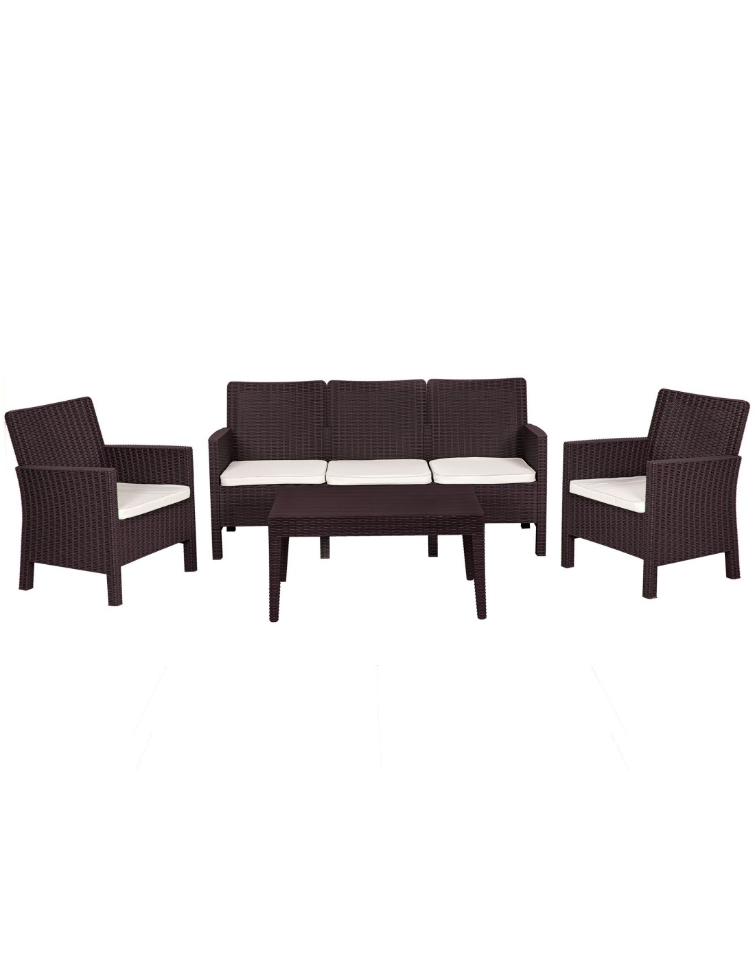 Set ADRIÁTICO, 2 Sillones + Sofá 3 plazas + mesa, polipropileno chocolate, cojines incluidos