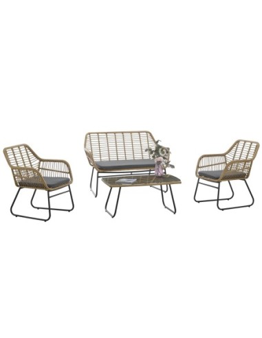 Set compuesto de: 2 unidades de Sillón, 1 unidad de Sofá de 2 plazas y una unidad de mesa baja, ratán beige. Cojines incluidos. Uso exterior e interior