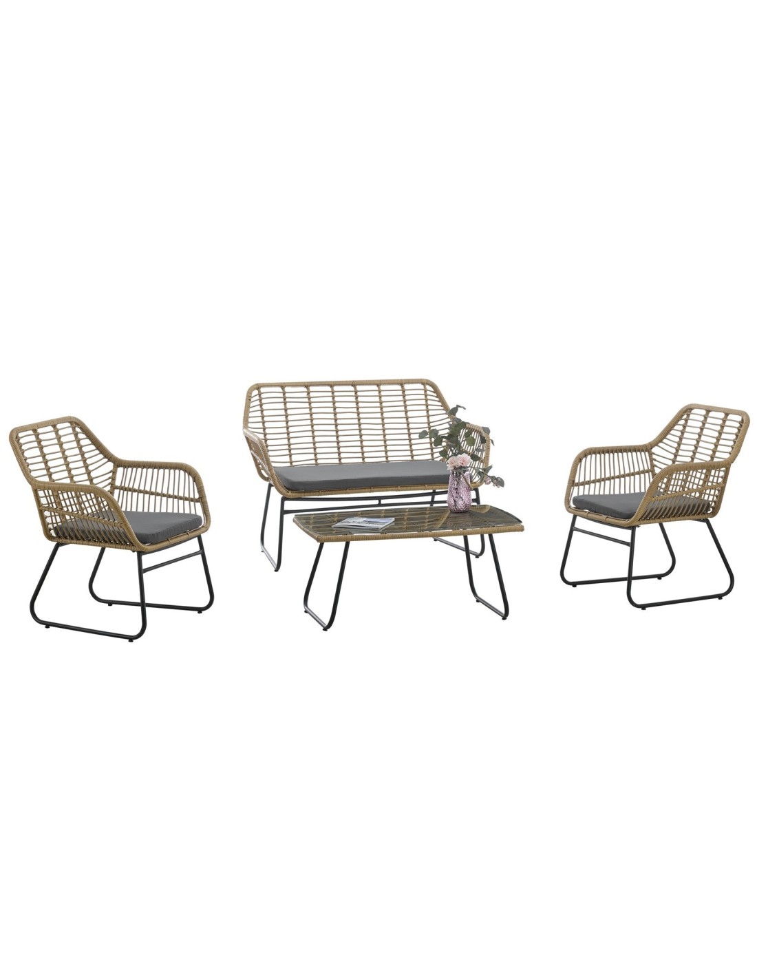 Set KROYA, 2 Sillones + Sofá 2 plazas + mesa, metal, ratán beige, cojines incluidos