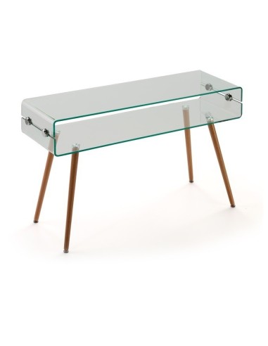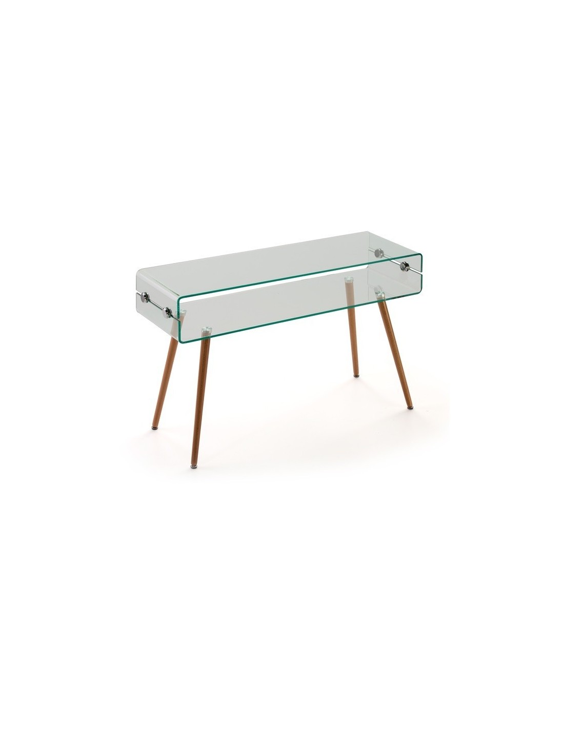 Consola de diseño fabricada íntegramente de cristal curvado con acabado transparente, estante inferior. Dispone de mesa baja rectangular a juego. Otras medidas disponibles