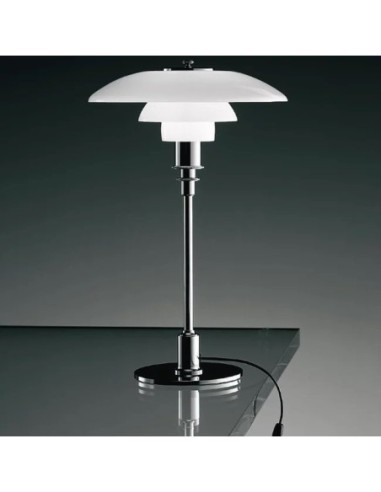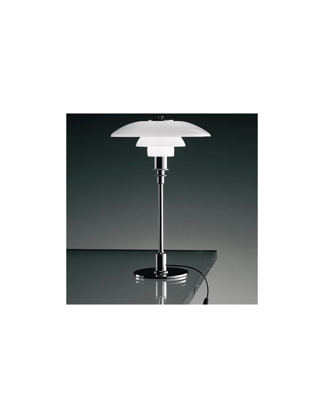 Lámpara de mesa, diseño, base cromada, tulipa cristal blanco