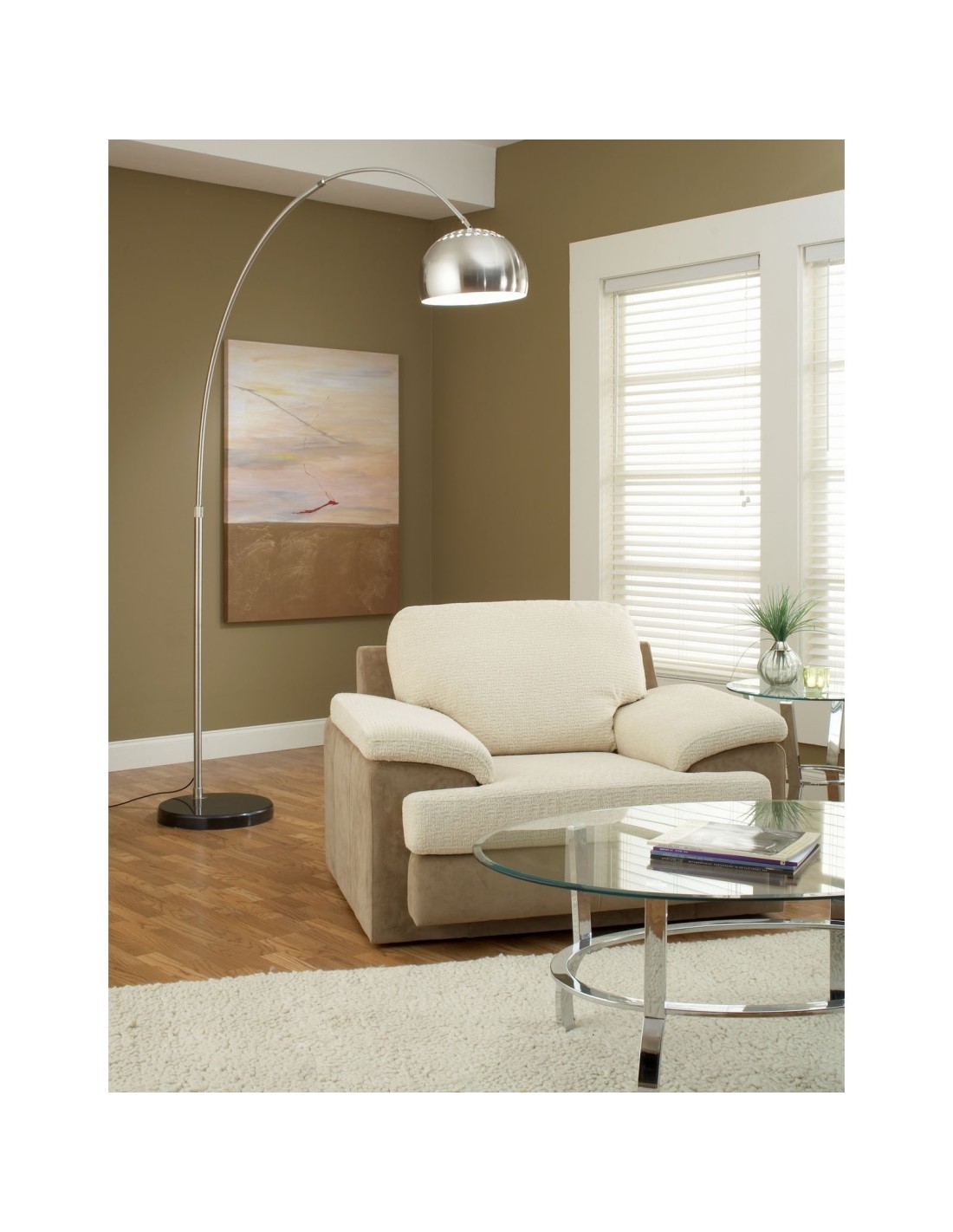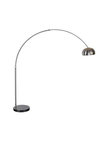 Lámpara de pie, diseño, cromada y base redonda de mármol negro.