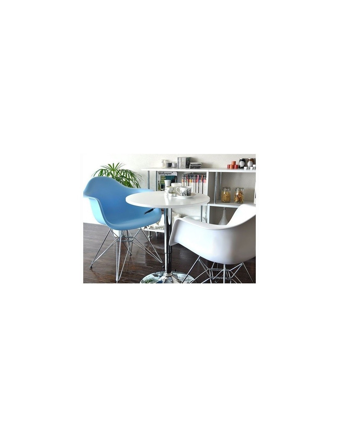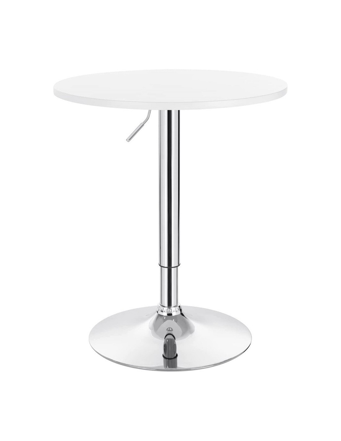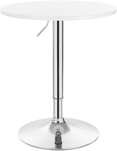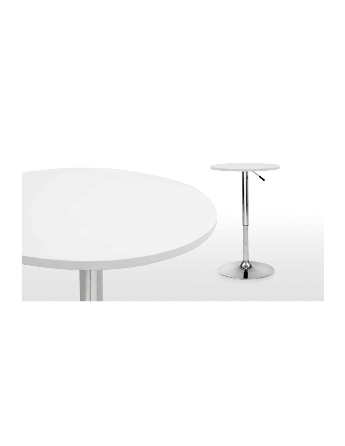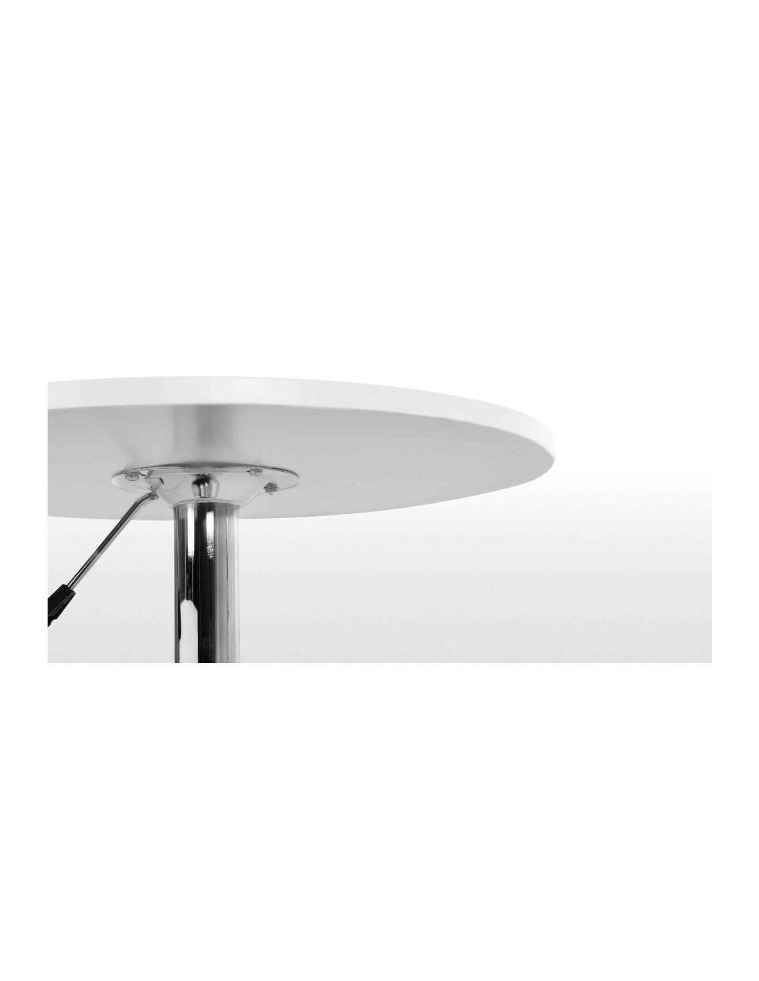 Mesa graduable en altura, diseño, multiusos, redonda, 70 cms diámetro, cromada, tapa soft blanca. Permite graduar la altura como mesa con altura standard y como mesa alta para taburetes.