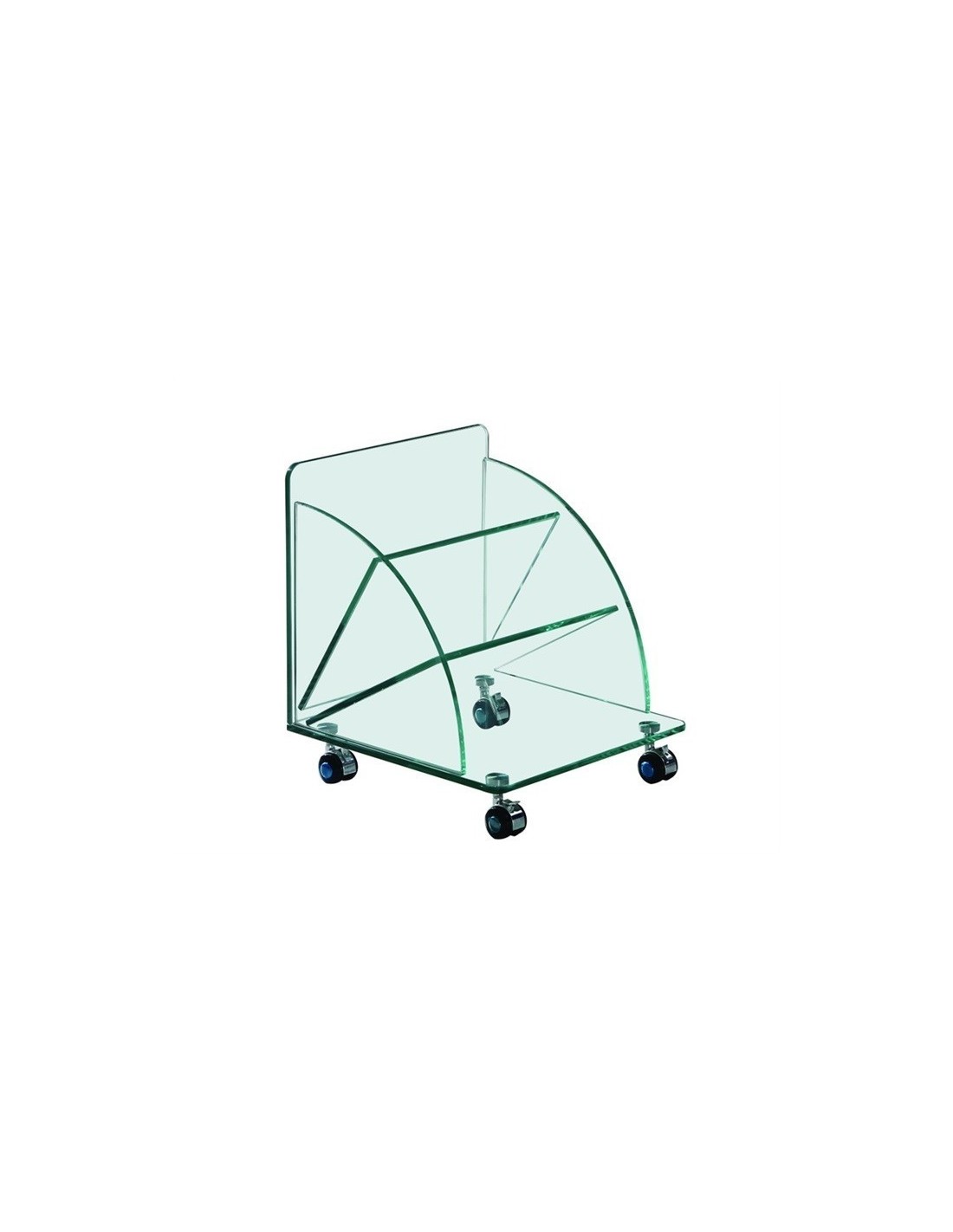 Mesa baja de diseño, ruedas, cristal curvado.