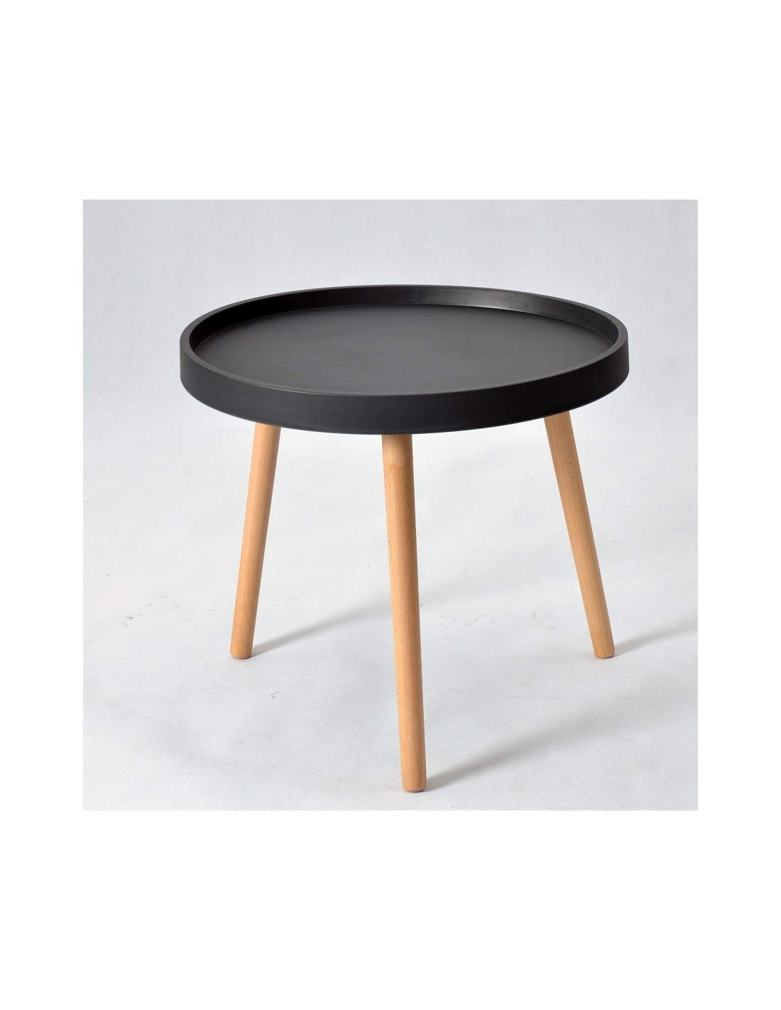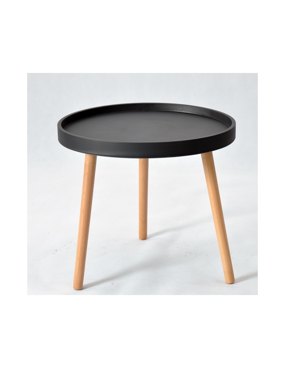 Mesa auxiliar baja de diseño, patas de madera de haya, tapa de polipropileno de color negro. Otros colores disponibles.