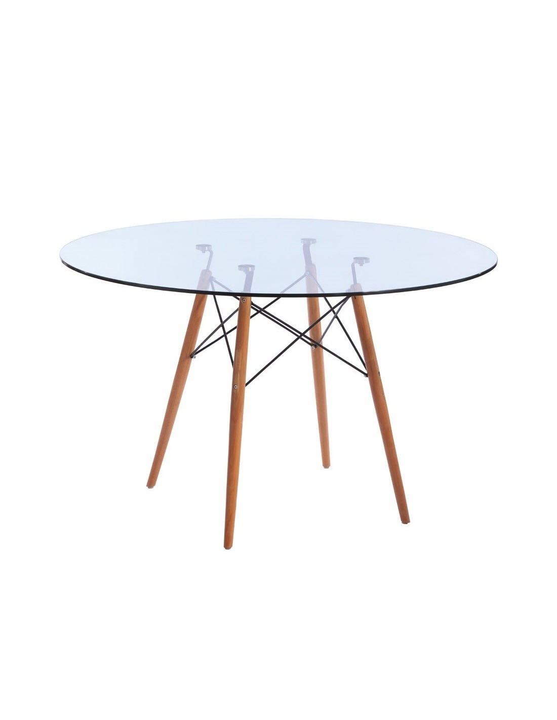 Mesa de diseño, base de madera, tapa de cristal templado. Sillas y sillones a juego