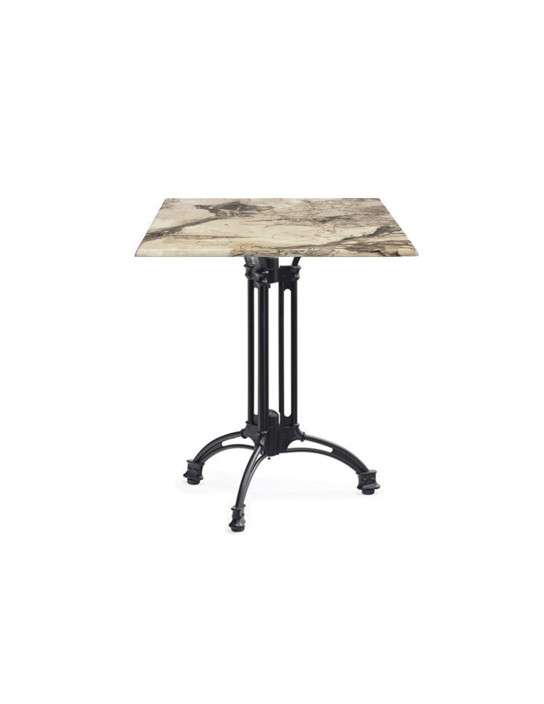 Mesa de fundición de aluminio de 3 puntas, revestida con pintura de resina negro mate y tapa de 60 x 60 cms. Color a elegir. Uso interior y exterior.