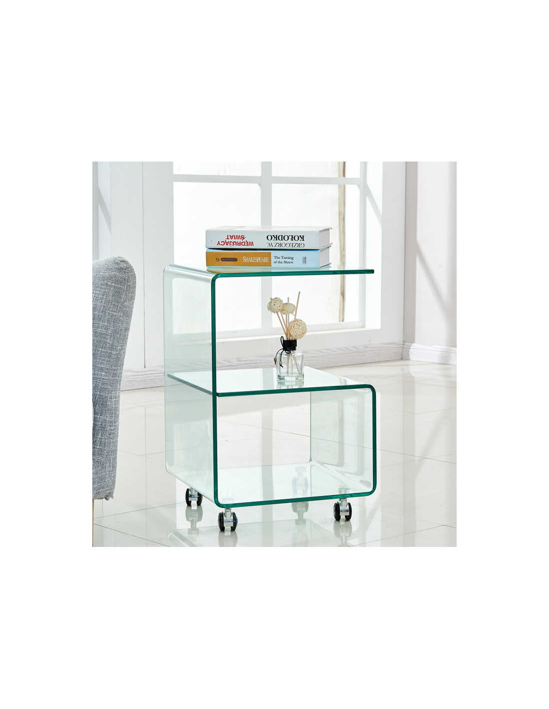 Mesa ABIGAIL, ruedas, cristal transparente, 40 x 40 cms