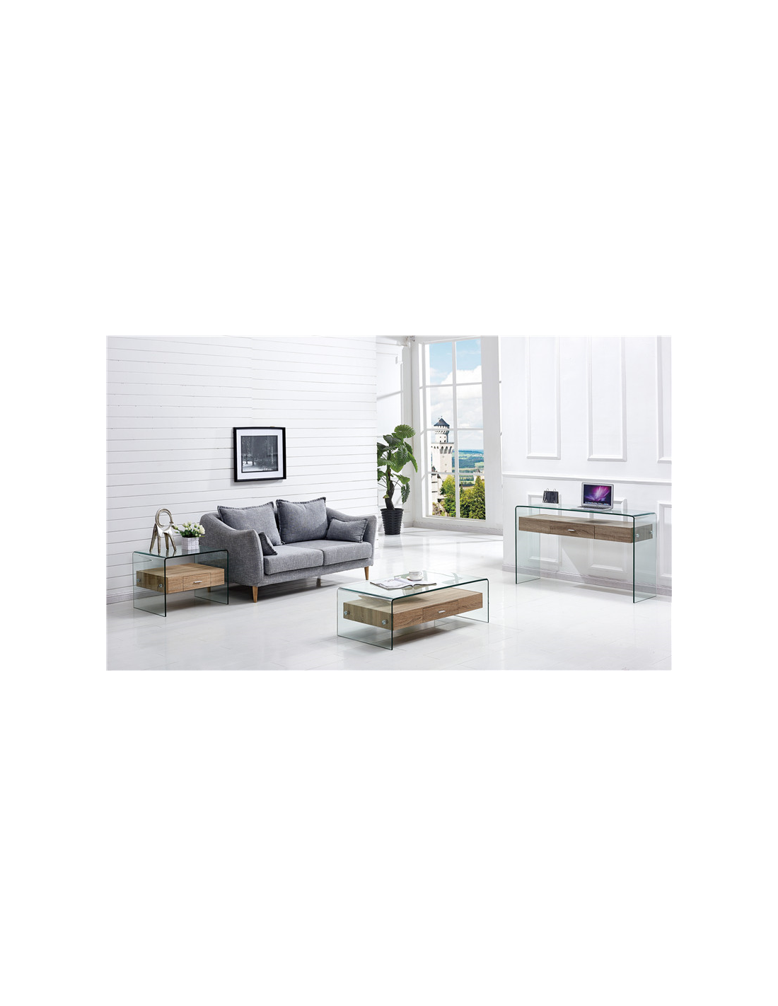 Mesa baja de diseño, estante con cajón de MDF, cristal curvado de 12 mm. de espesor