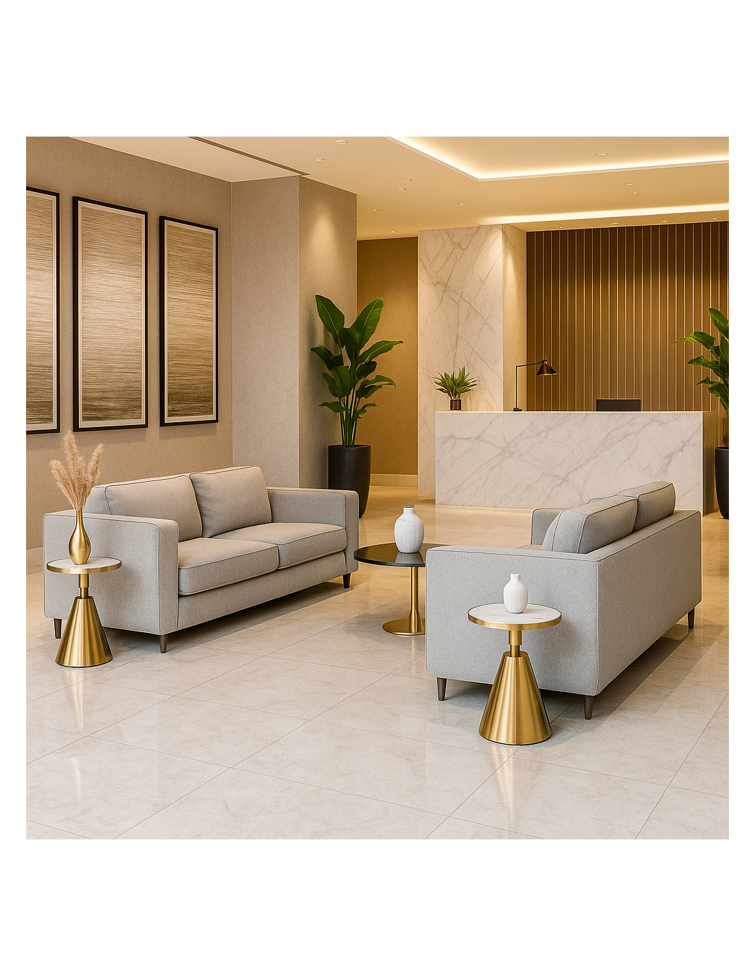 Mesa baja, diseño, armazón de acero inoxidable con acabado dorado, tapa de cerámica imitando a mármol blanco,  50 cms de diámetro. Altura 56 cms. Otros colores disponibles