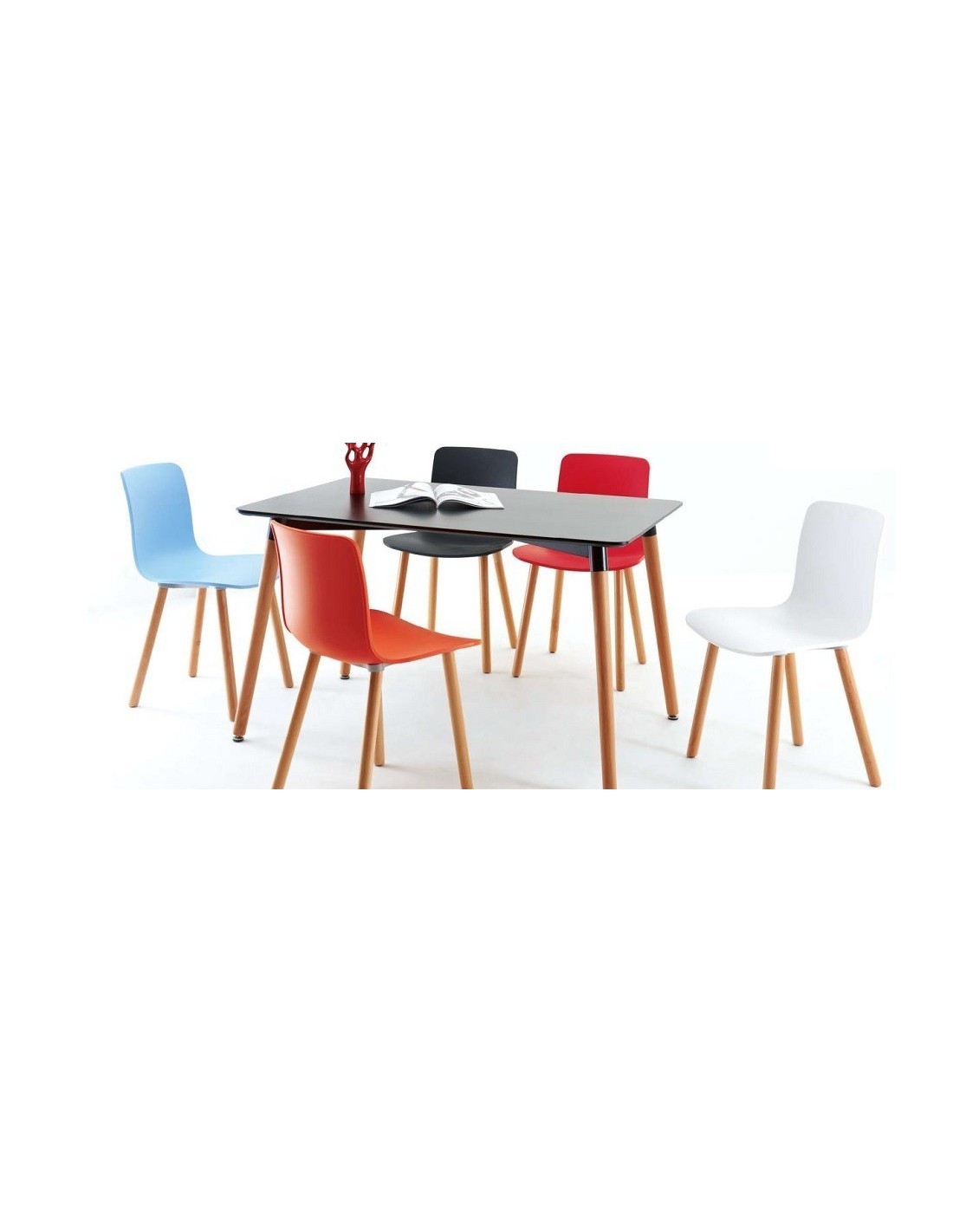 Mesa de diseño, patas de madera de haya maciza, tapa lacada en negro. Otros colores disponibles. Sillas y sillones a juego