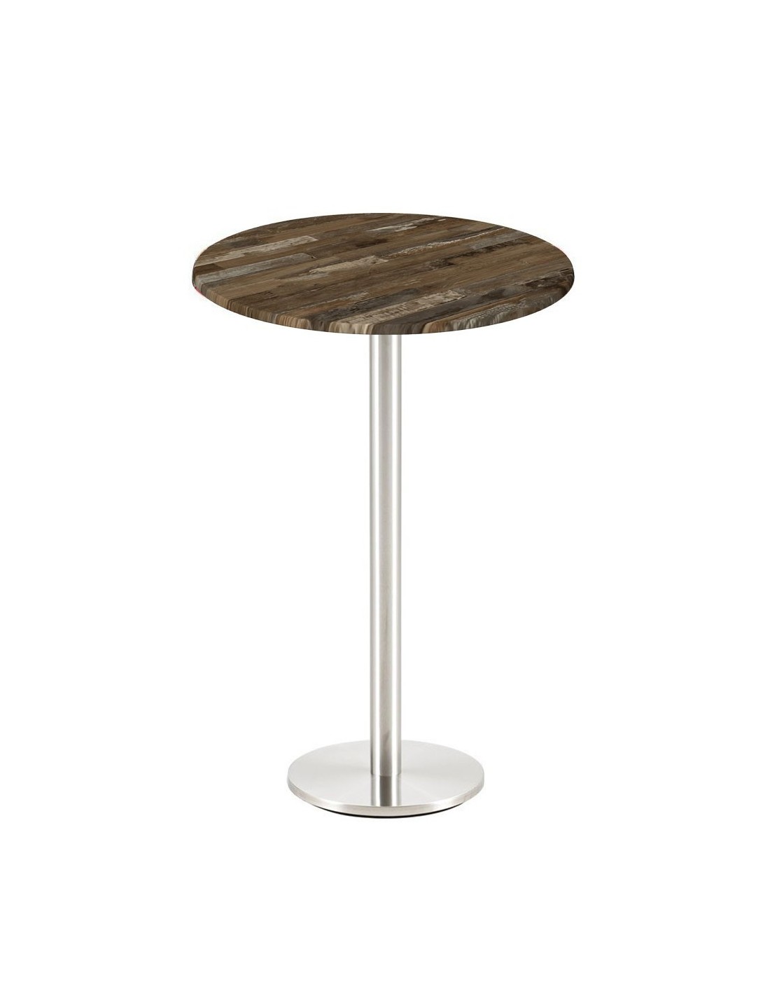 Mesa alta con pie central, acero inoxidable pulido - acabado satinado -. Base circular de 45 cms y tapa de 60 cms de diámetro, a elegir. Uso en interiores.