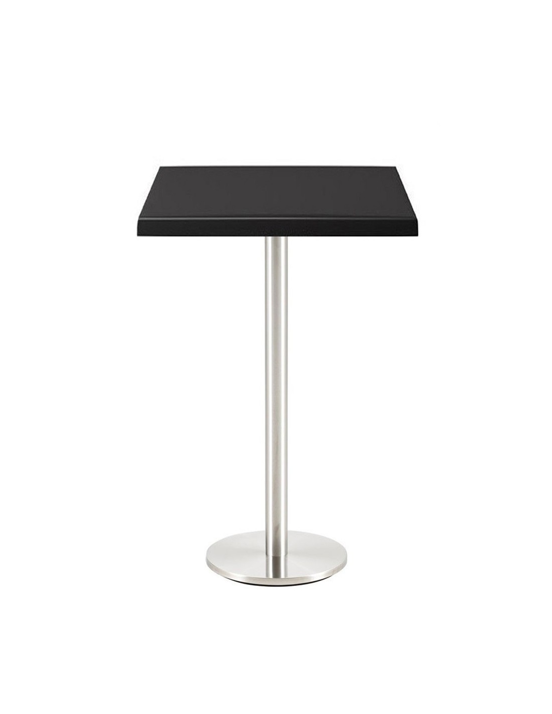 Mesa alta con pie central, acero inoxidable pulido - acabado satinado -. Base circular de 45 cms y tapa de 60X60 cms, a elegir. Uso en interiores.