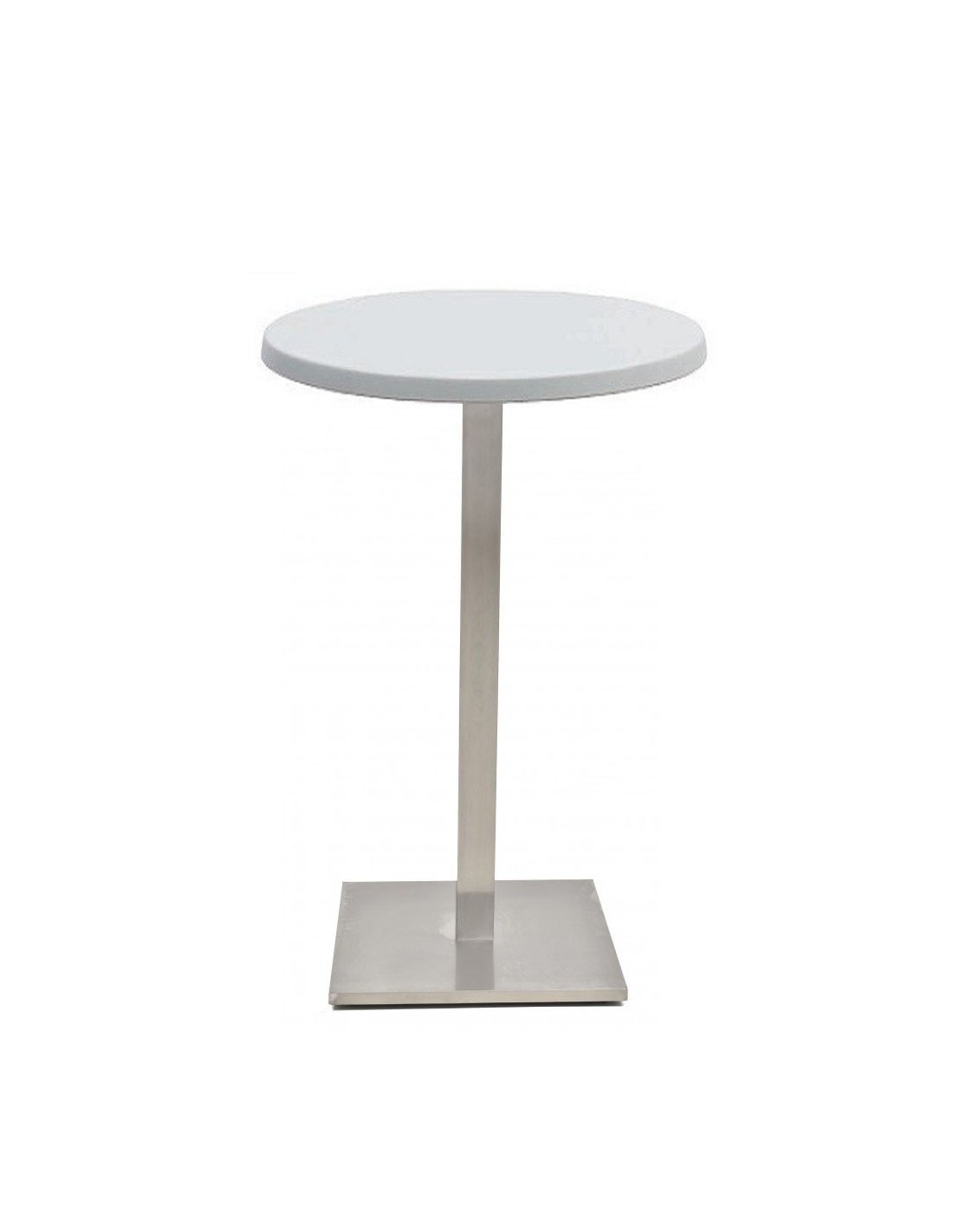Mesa alta con pie central, acero inoxidable pulido - acabado satinado -. Base de 45 x 45 cms y tapa de 60 cm de diámetro, a elegir. Uso en interiores.