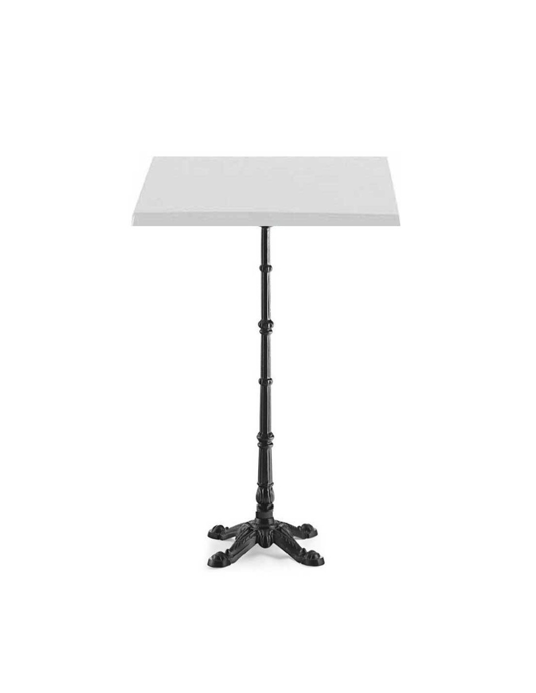 Mesa alta con base de fundición de hierro de 4 puntas, revestida con pintura de resina negro mate y tapa de 70x70 cms, a elegir.