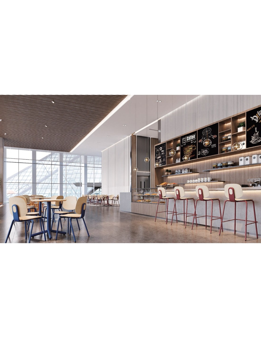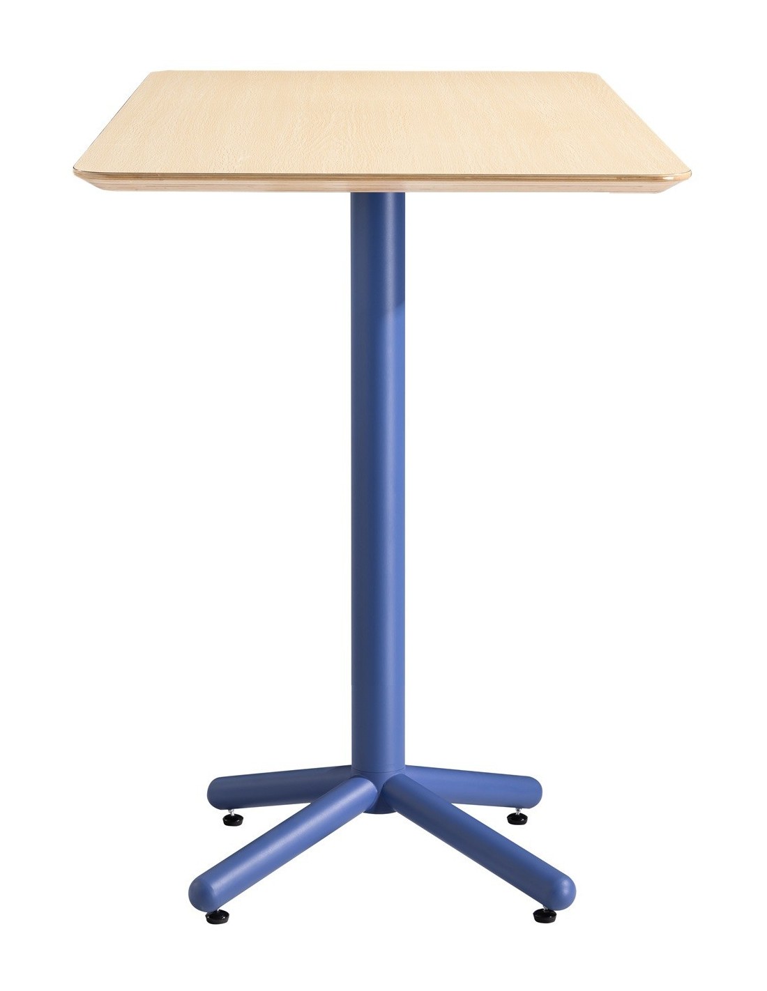 Mesa alta de diseño, multiusos, armazón central tubular con acabado azul, tapa cuadrada de contrachapado revestido con HPL con acabado  natural. Taburete y mesas a juego.