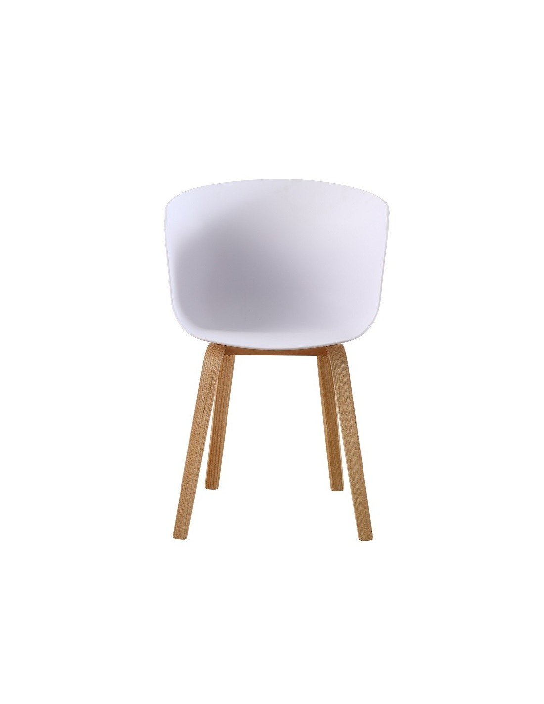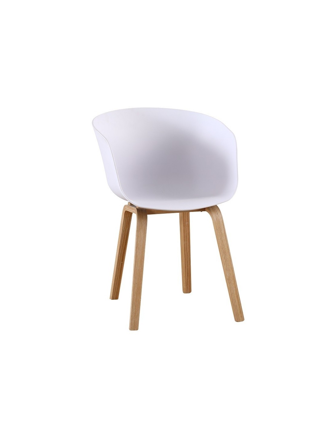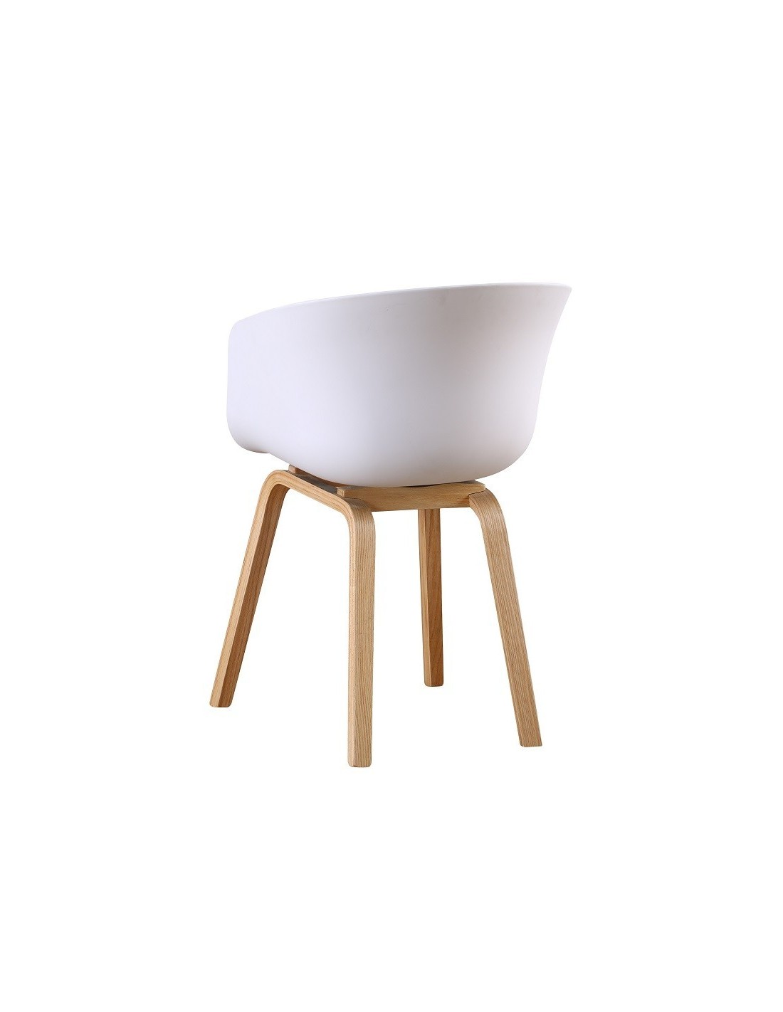 Sillón de diseño, armazón de madera curvada, carcasa de polipropileno blanco. Taburete a juego