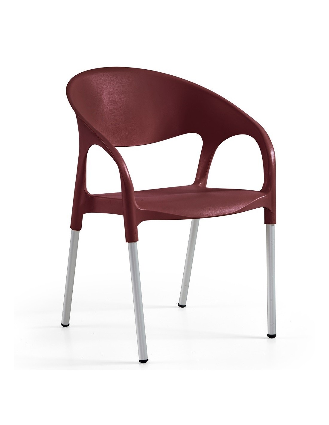 Sillón apilable, patas de aluminio anodizado, polipropileno burdeos. Uso en exterior e interior. Otros colores disponibles