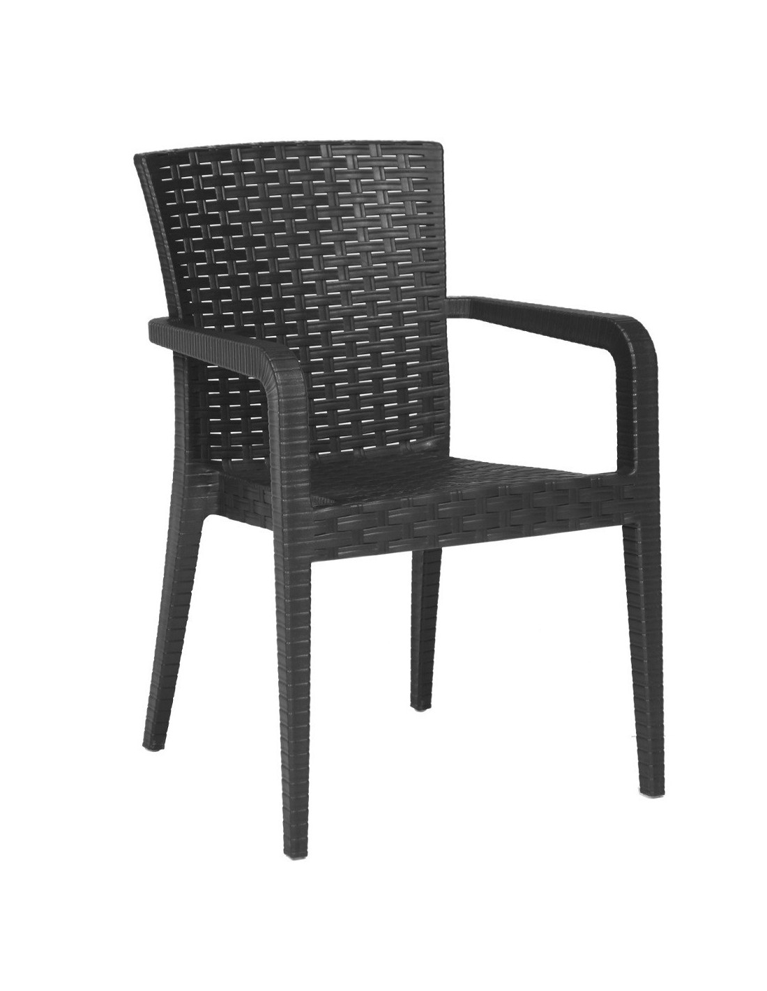 Sillón apilable, imitación a rattán, polipropileno antracita. Uso en exterior e interior. Otros colores disponibles. Mesas a juego.