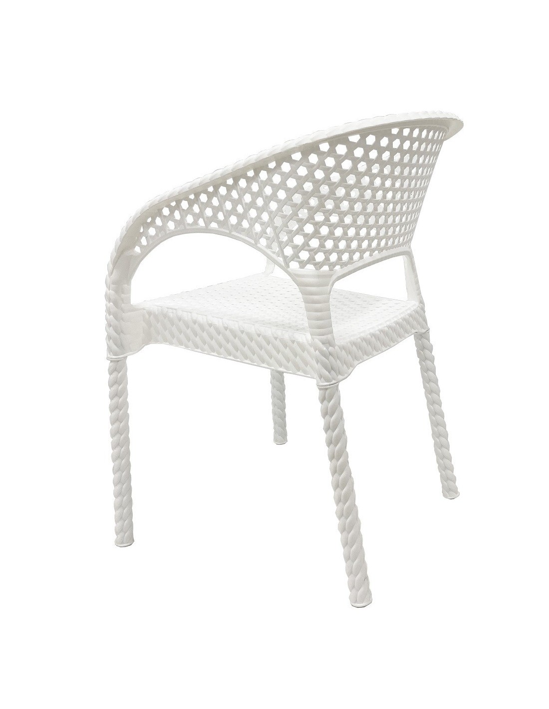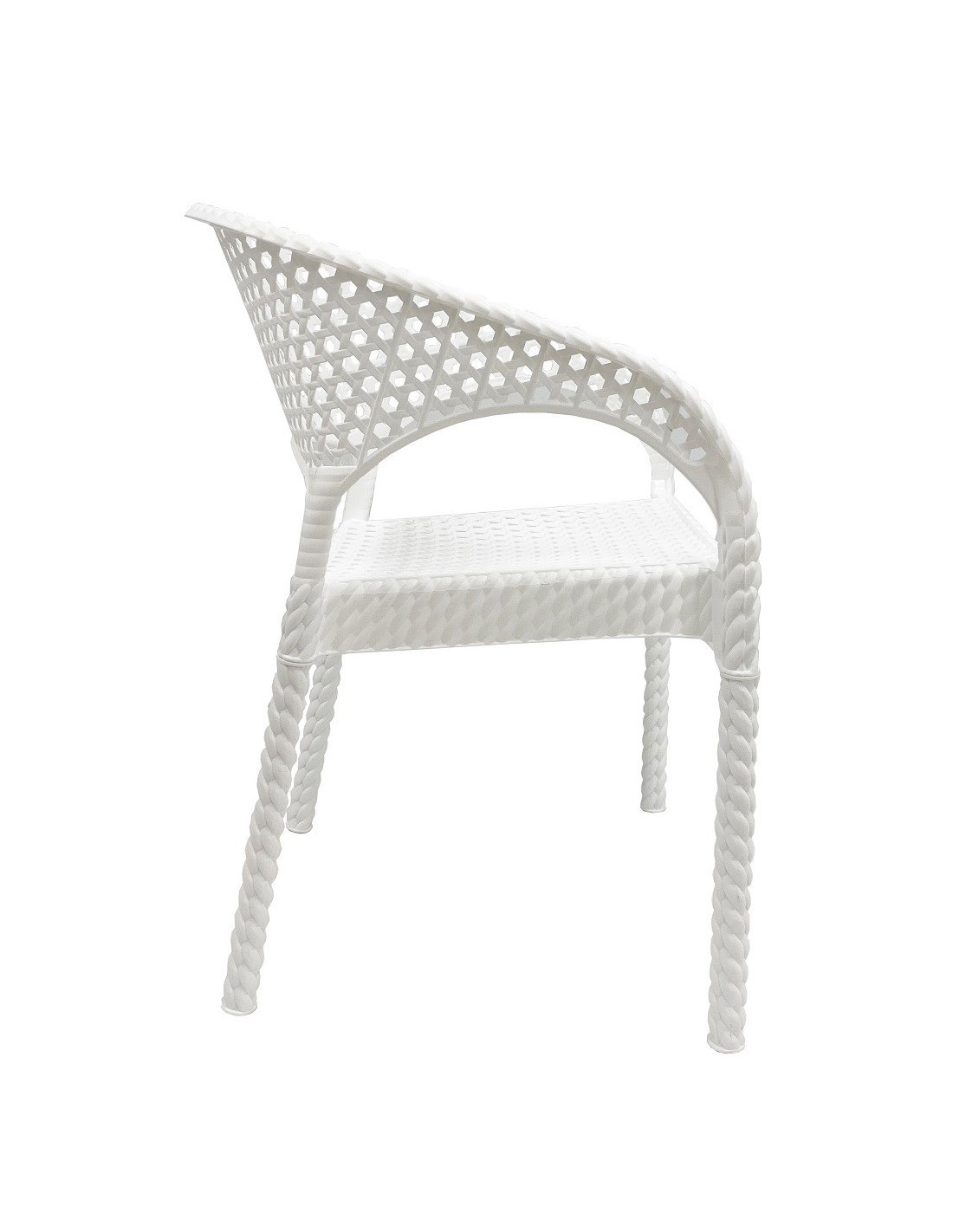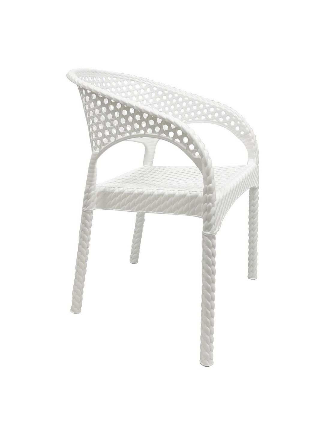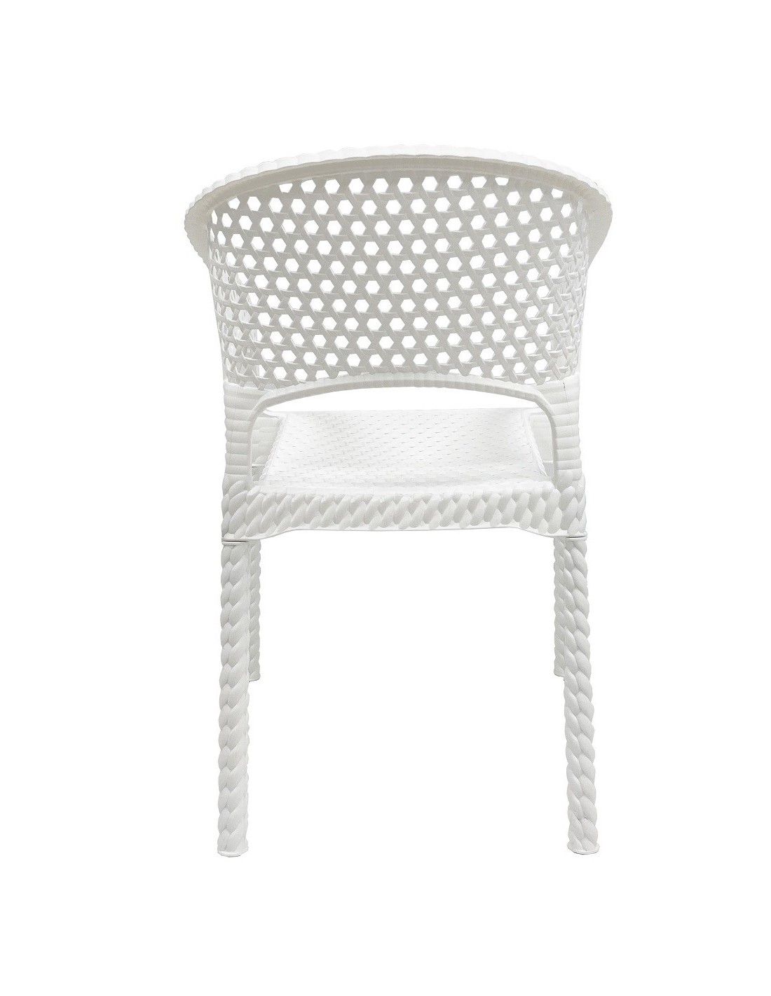 Sillón apilable, imitación a rattán, polipropileno blanco. Uso en exterior e interior. Otros colores disponibles.