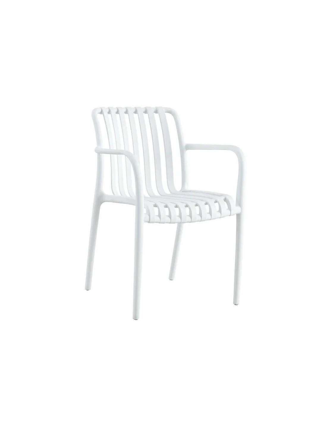 Sillón apilable, polipropileno blanco. Uso en exterior e interior. Otros colores disponibles. Mesas a juego.