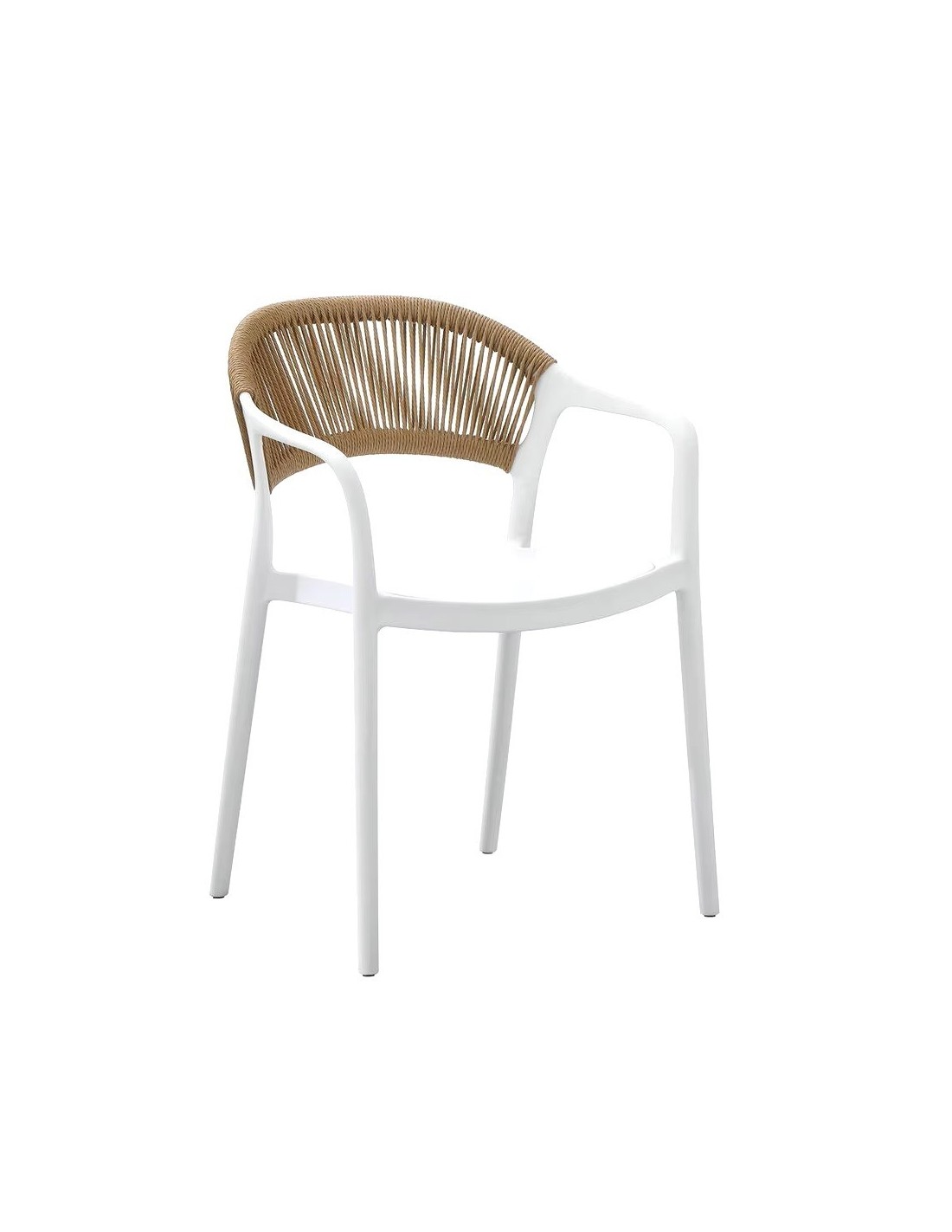 Sillón apilable, tratamiento anti UV, polipropileno blanco, respaldo en cuerda de color natural, uso en exterior e interior. Otros colores disponibles.