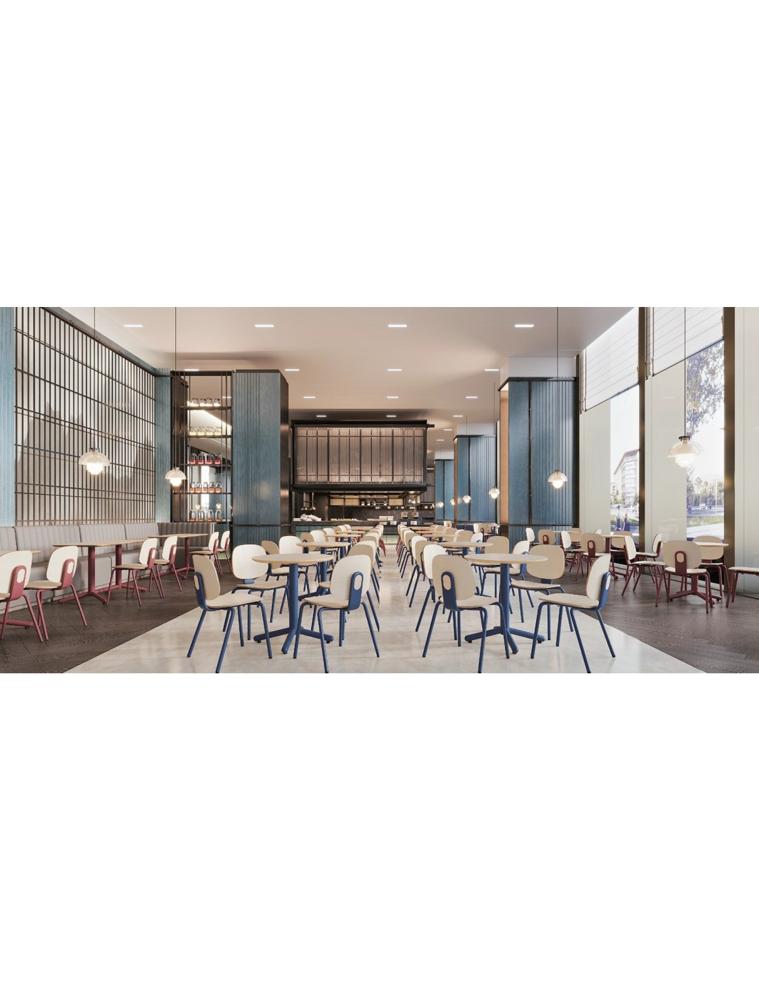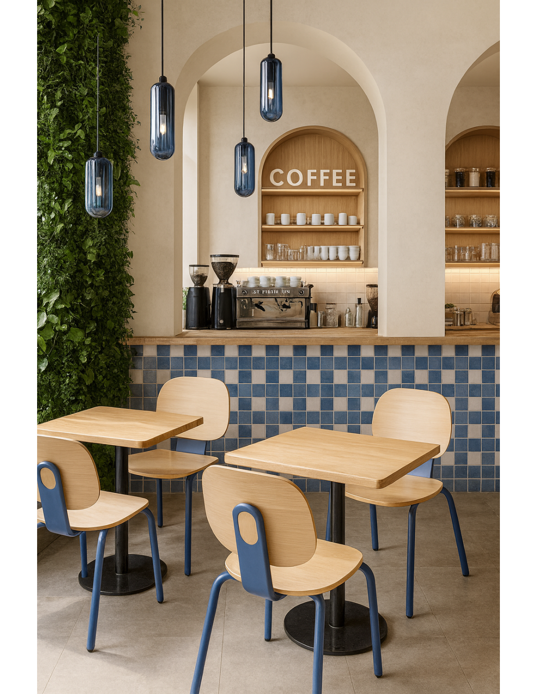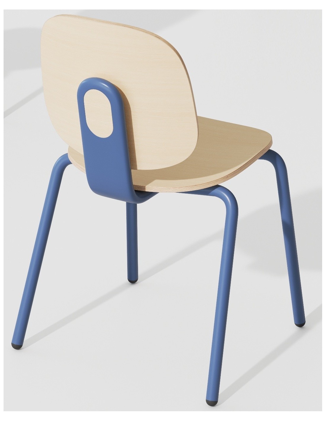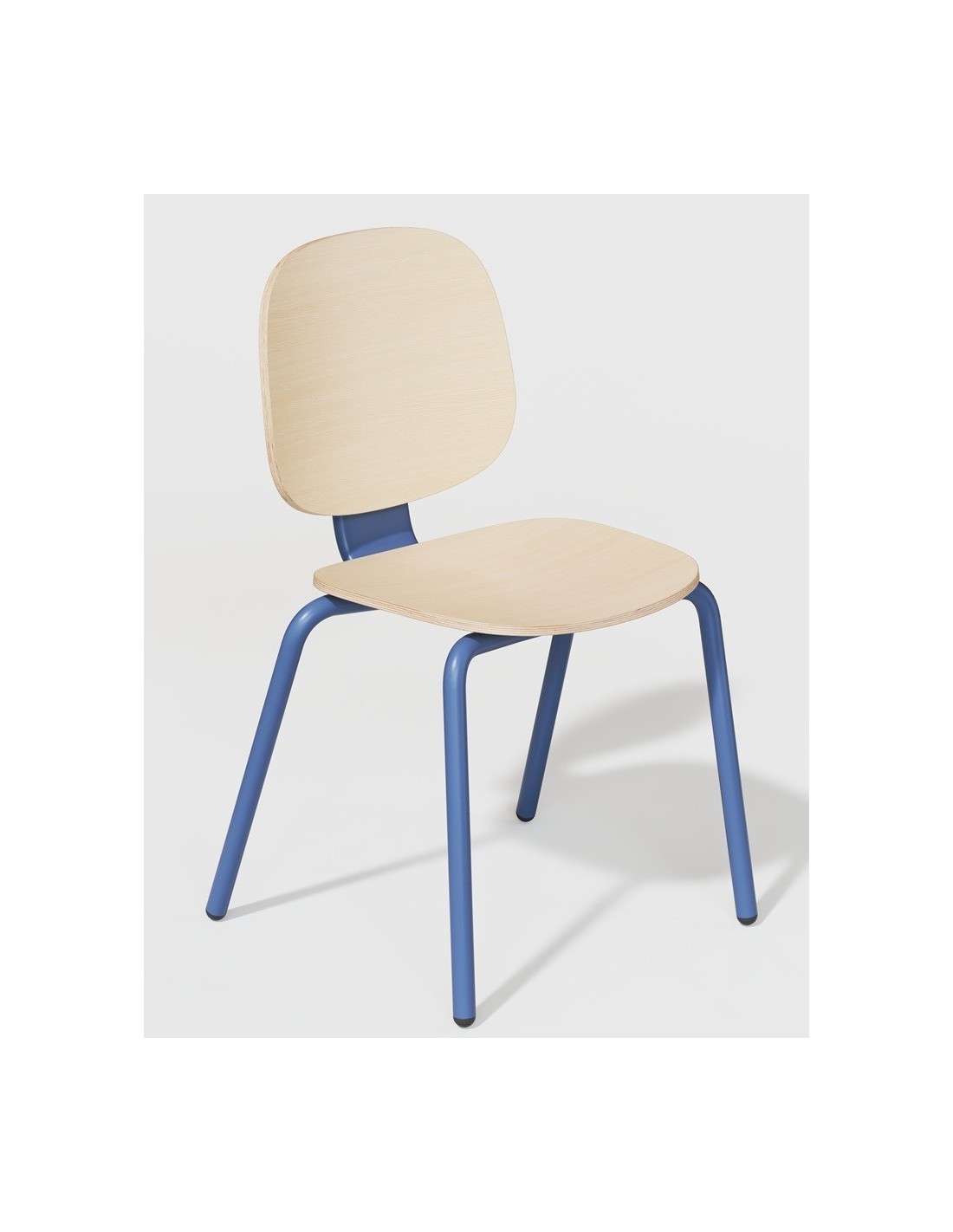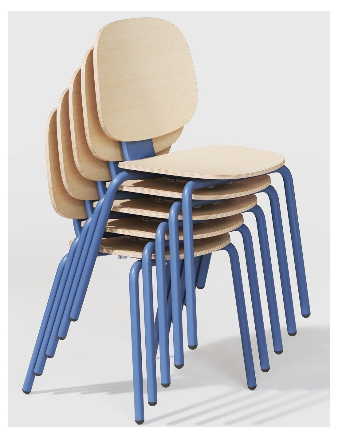 Silla de diseño, multiusos, apilable, armazón tubular con acabado azul, asiento y respaldo de contrachapado revestido con HPL con acabado natural. Taburete y mesas a juego.