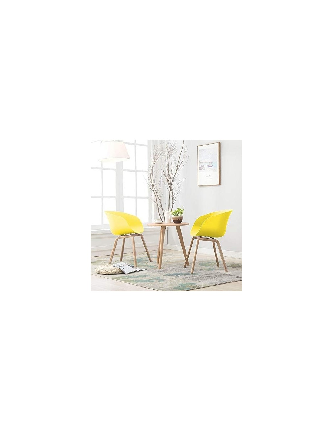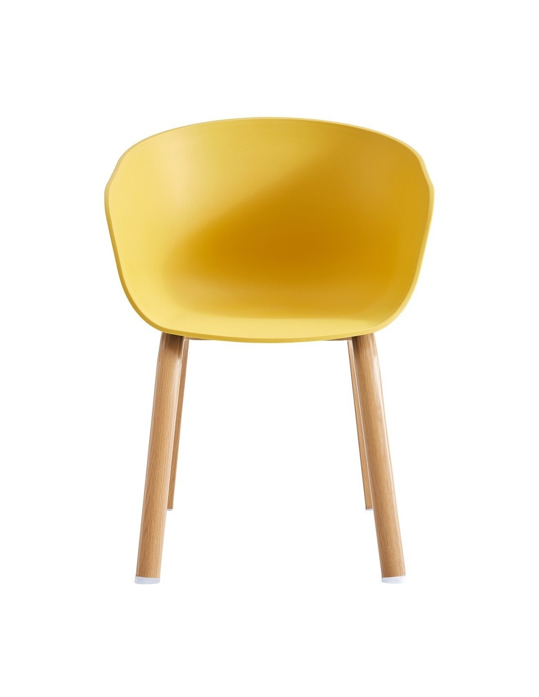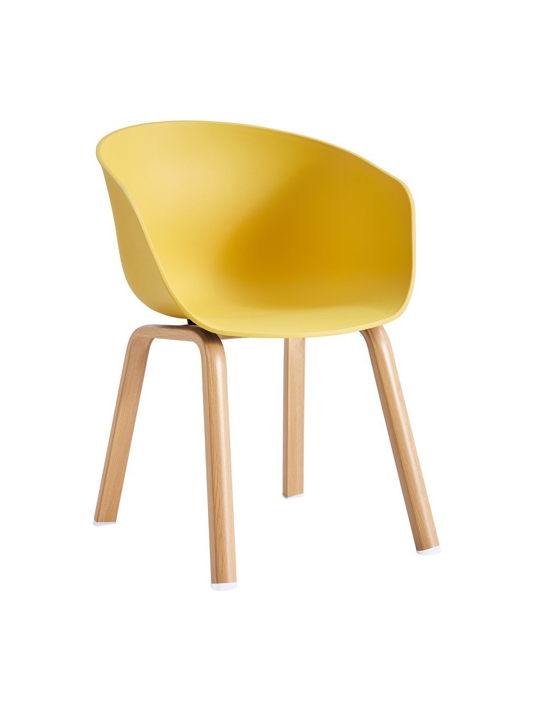 Sillón de diseño, patas de metal con acabado madera, carcasa de polipropileno amarillo. Taburete a juego