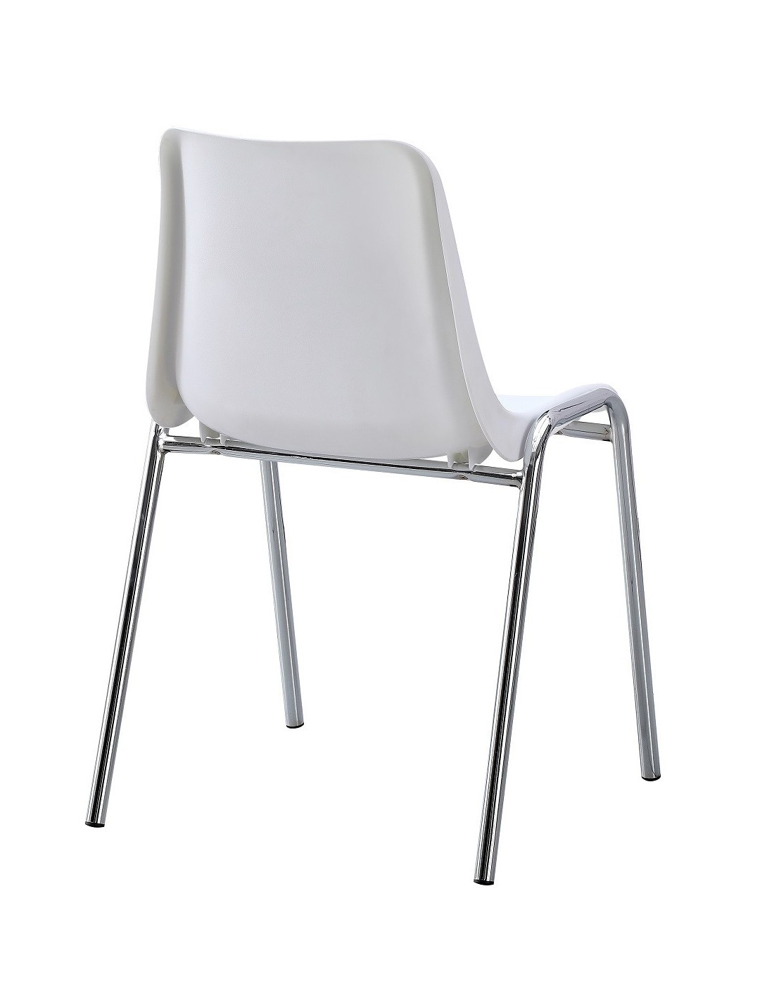 Silla apilable con asiento monoblock de polipropileno blanco. Armazón tubular cromado. Otros colores disponibles