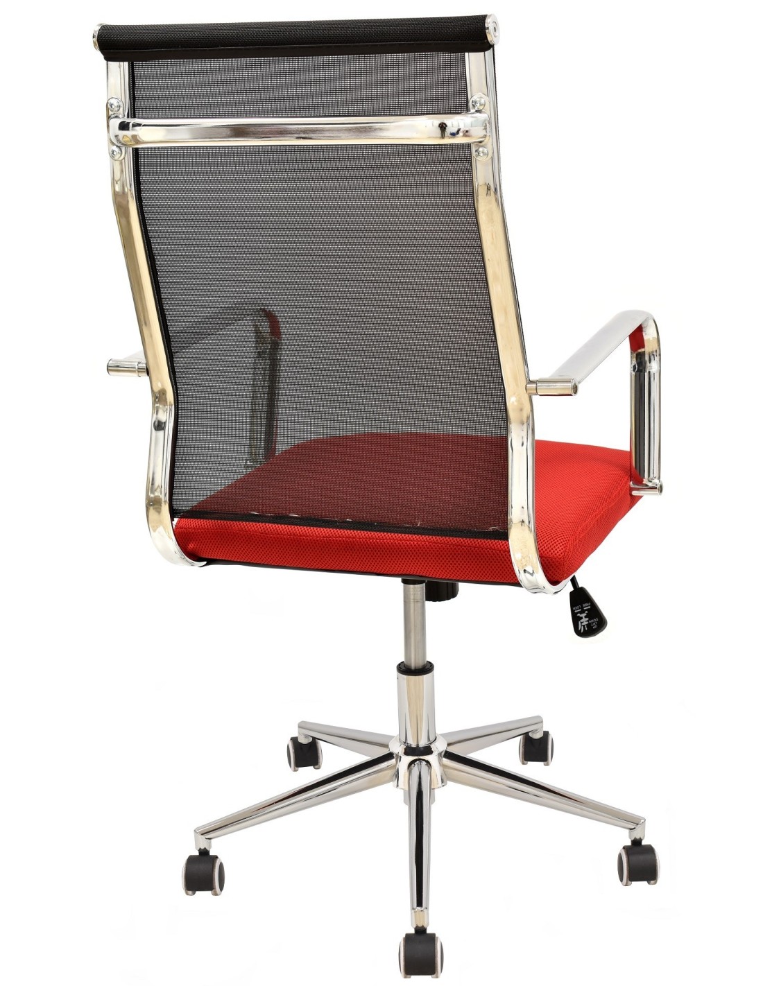 Sillón de dirección, alto, regulación de altura, basculante, respaldo tapizado en malla negra, asiento en tejido mesh rojo. Otros colores disponibles.