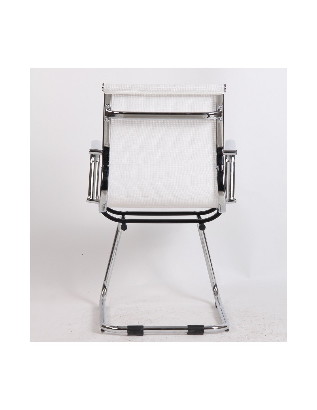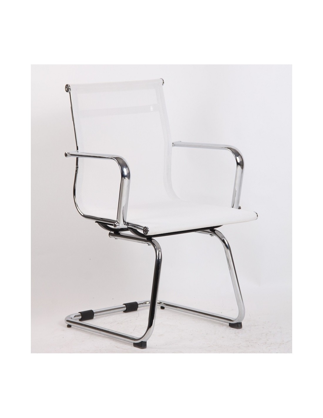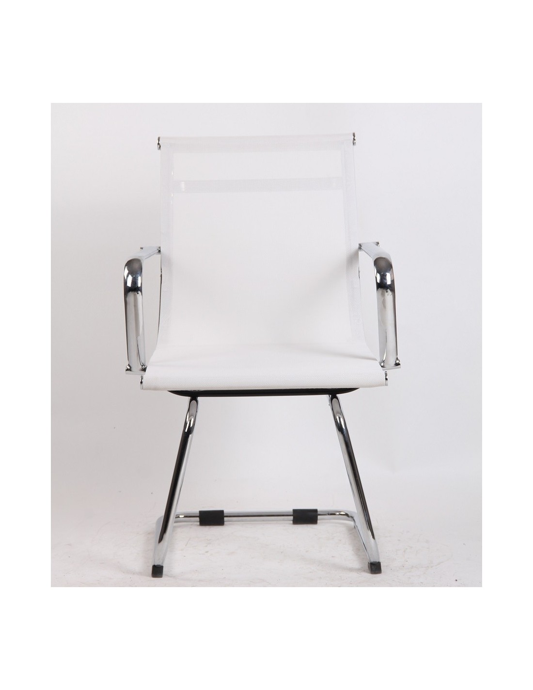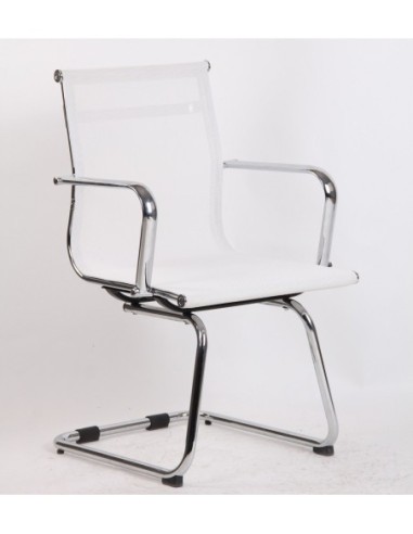 Sillón fijo de patín, diseño, cromado, tapizado malla blanca. Otros colores disponibles. Sillón medio giratorio y sillón de dirección a juego..