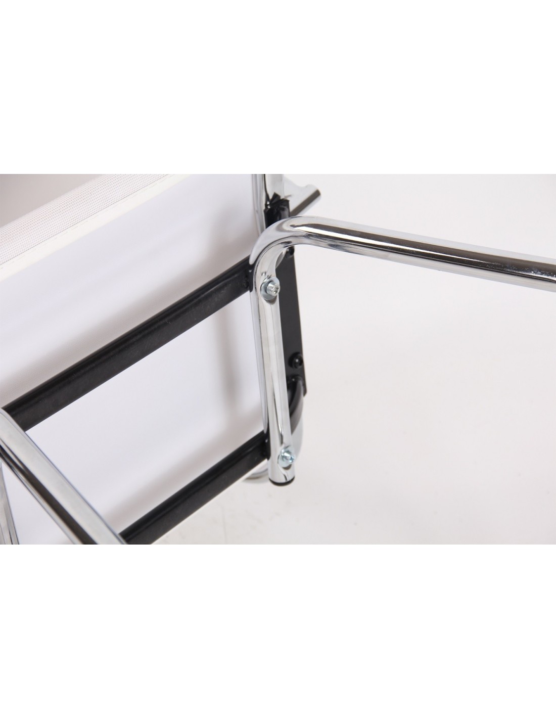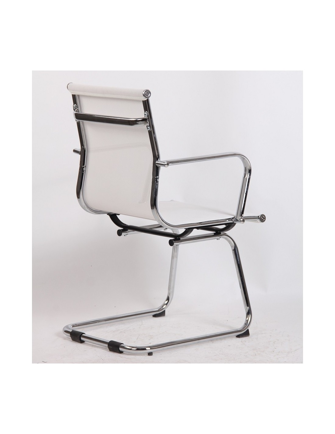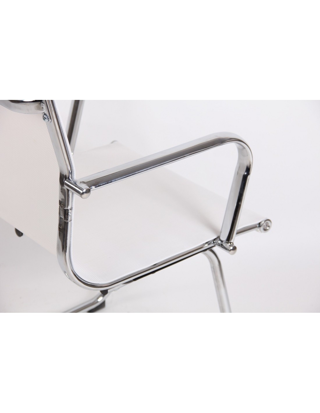 Sillón fijo de patín, diseño, cromado, tapizado malla blanca. Otros colores disponibles. Sillón medio giratorio y sillón de dirección a juego..