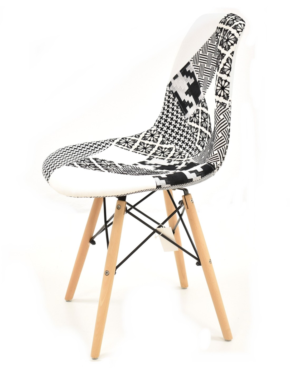 Silla de diseño, multiusos, base de madera, asiento completo tapizado en tejido de diseño patchwork combi bgn. Sillón a juego. -IMPORTANTE: Se entrega con la base montada.