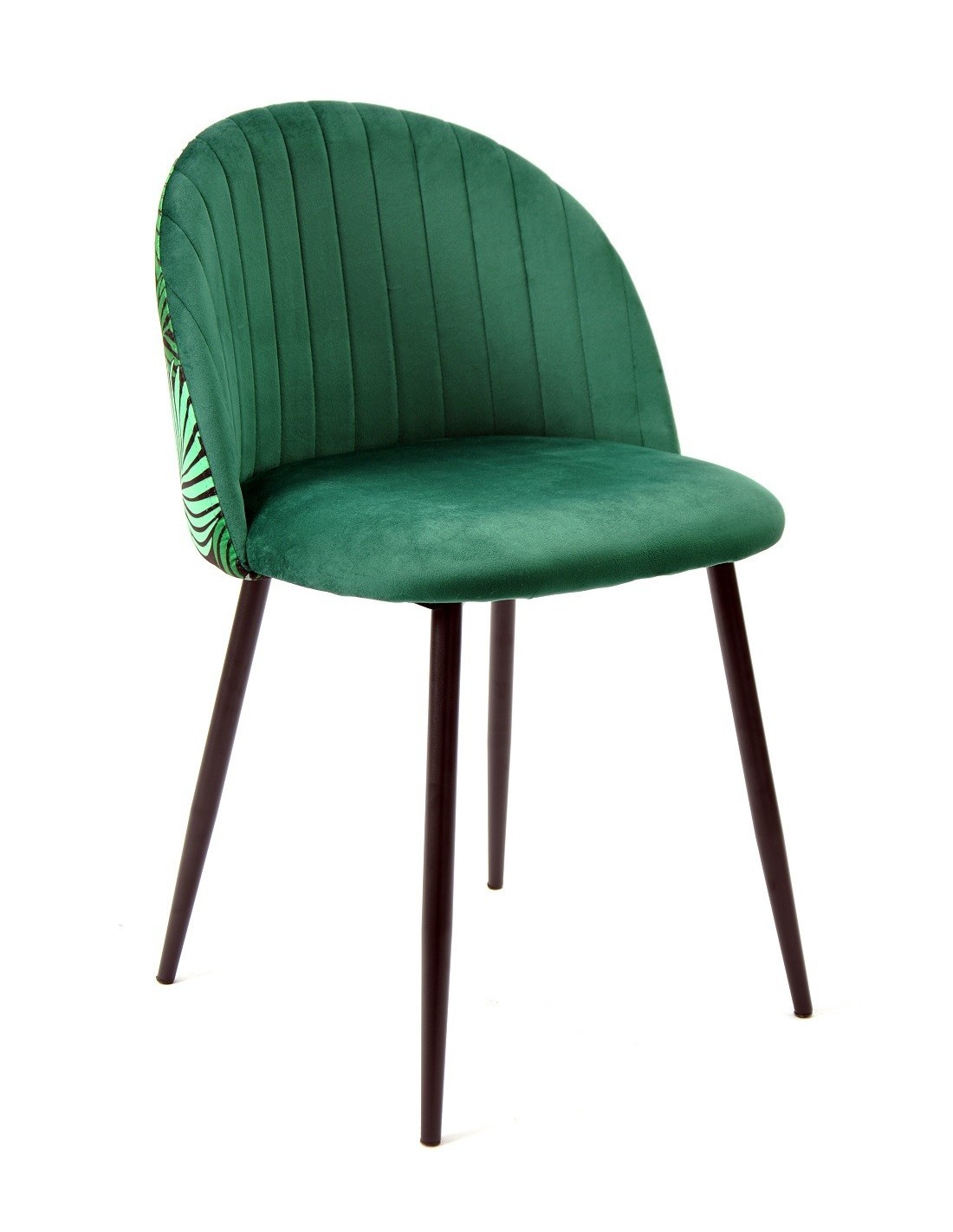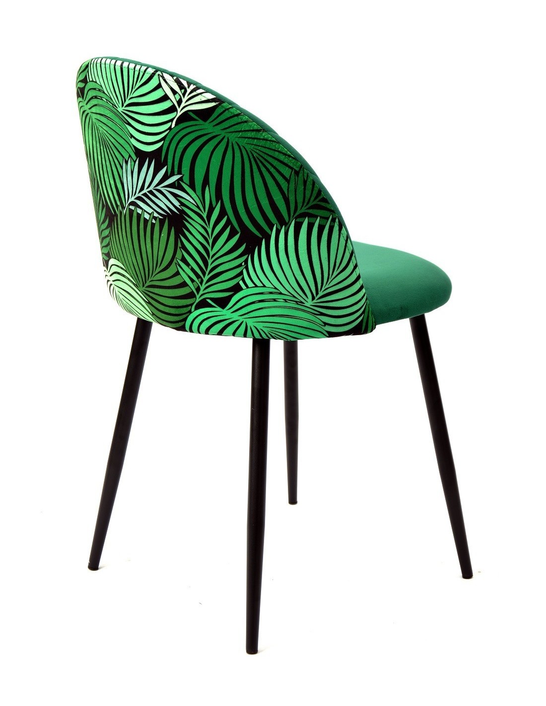 Silla de diseño, armazón metálico con acabado epoxi negro, asiento y respaldo tapizados en terciopelo verde, trasera en tejido decorado floral a juego. Otros colores disponibles. Taburete a juego