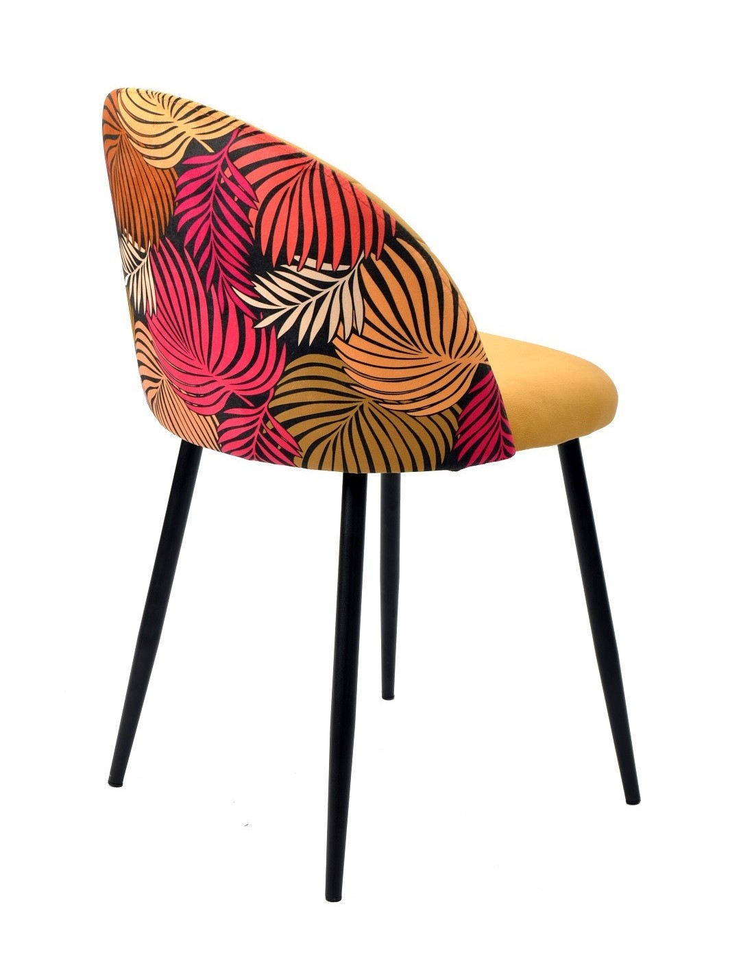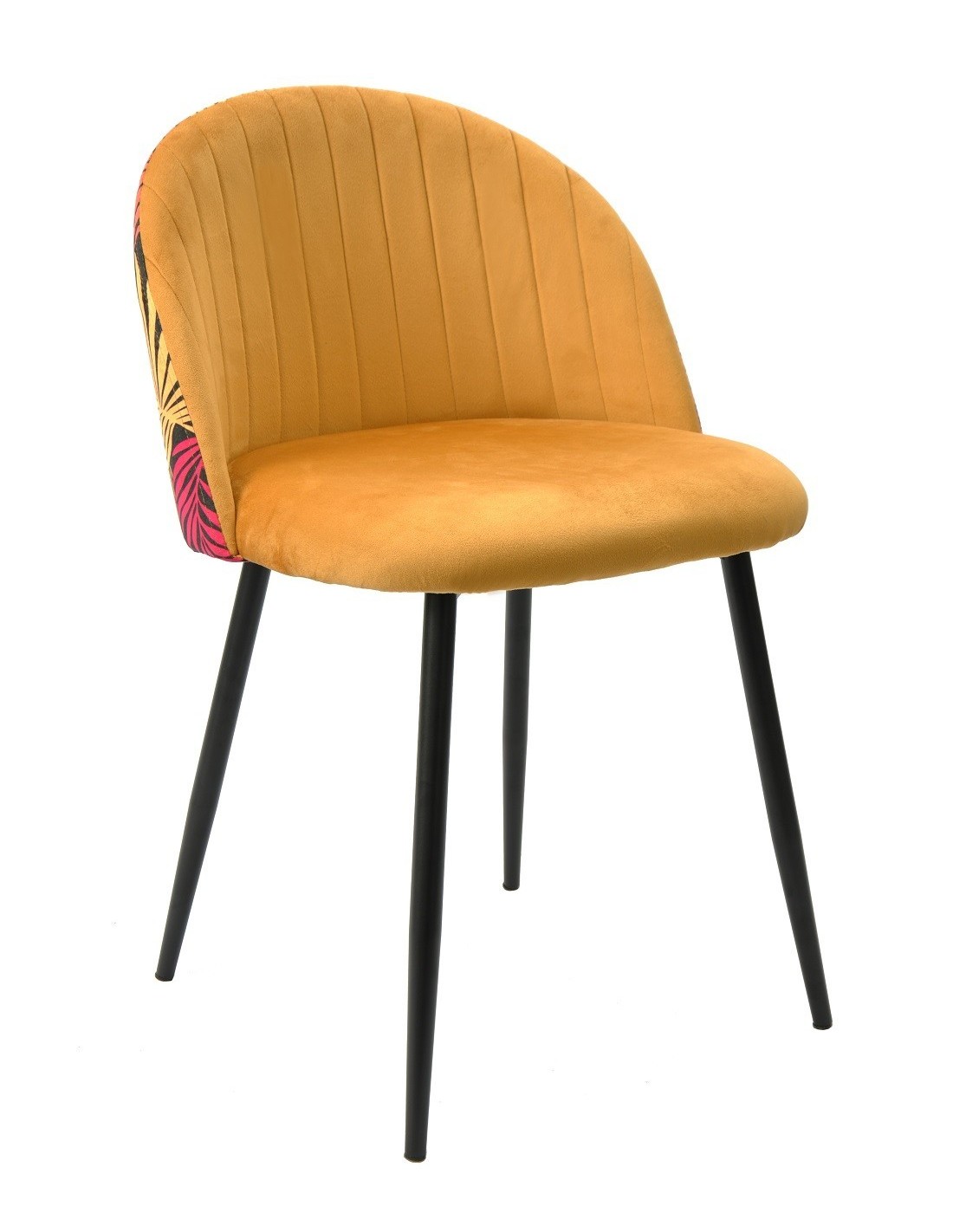 Silla de diseño, armazón metálico con acabado epoxi negro, asiento y respaldo tapizados en terciopelo amarillo, trasera en tejido decorado floral a juego. Otros colores disponibles. Taburete a juego