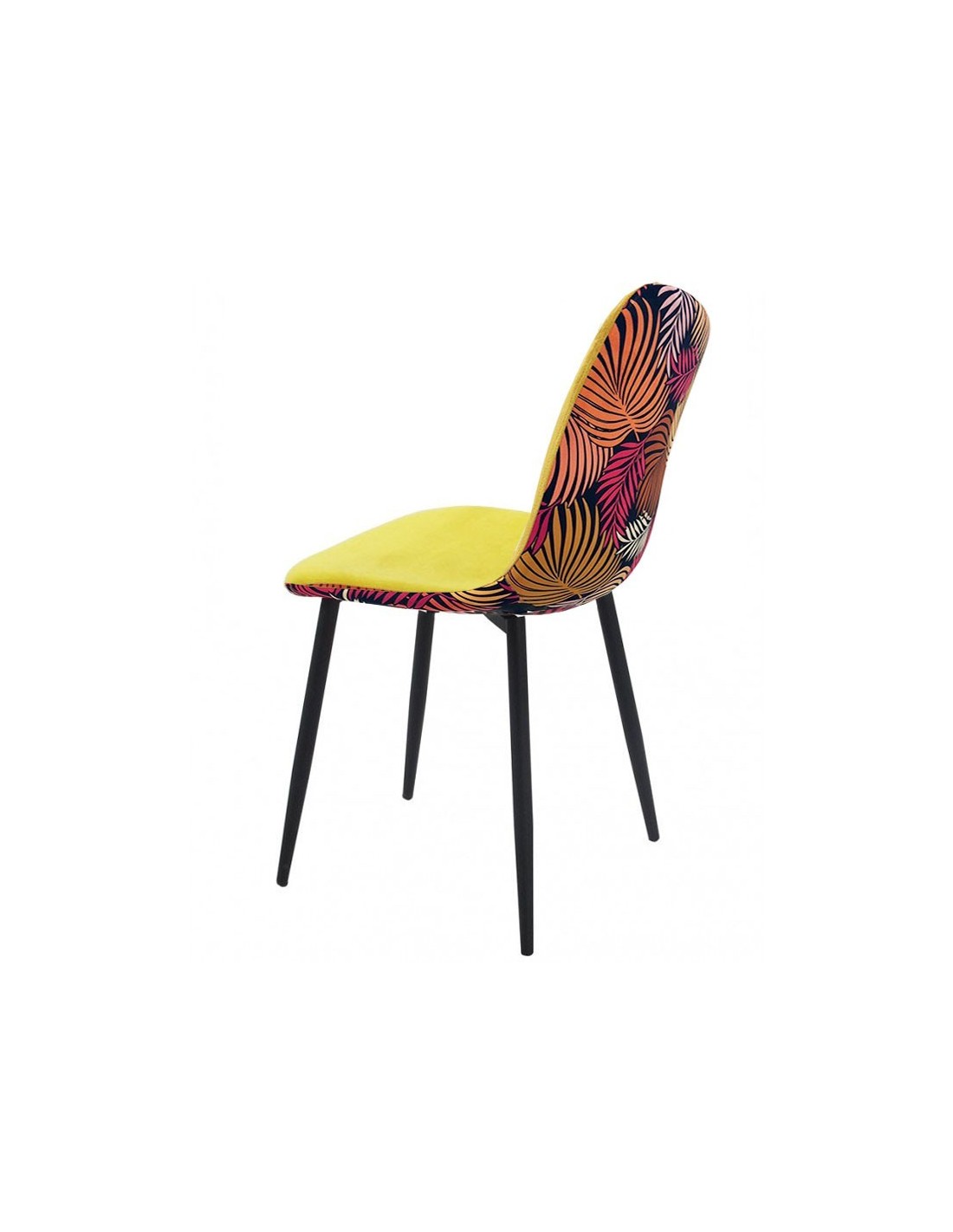 Silla de diseño, armazón metálico con acabado epoxi negro, asiento y respaldo tapizados en terciopelo amarillo, trasera en tejido decorado floral a juego. Otros colores disponibles. Taburete a juego