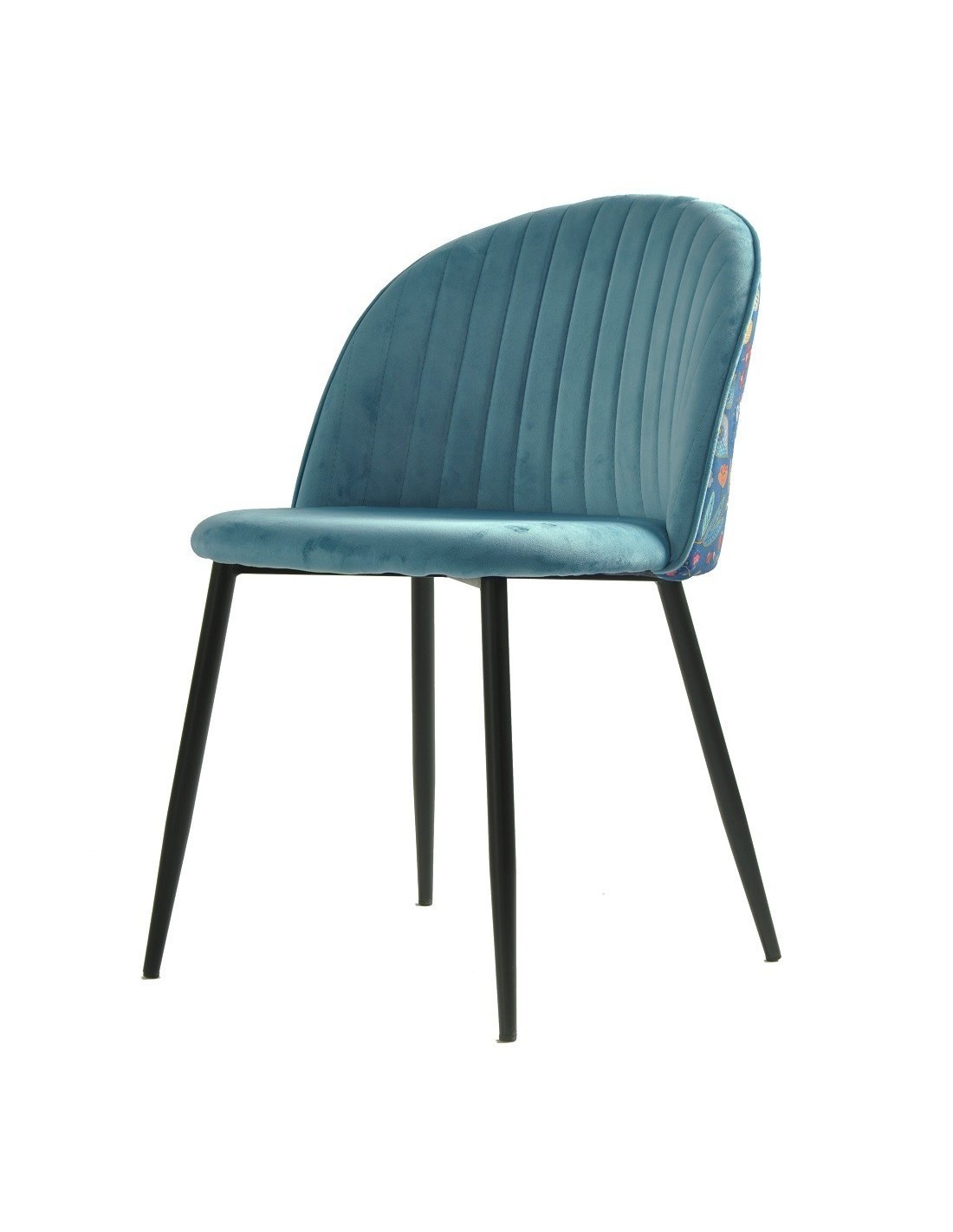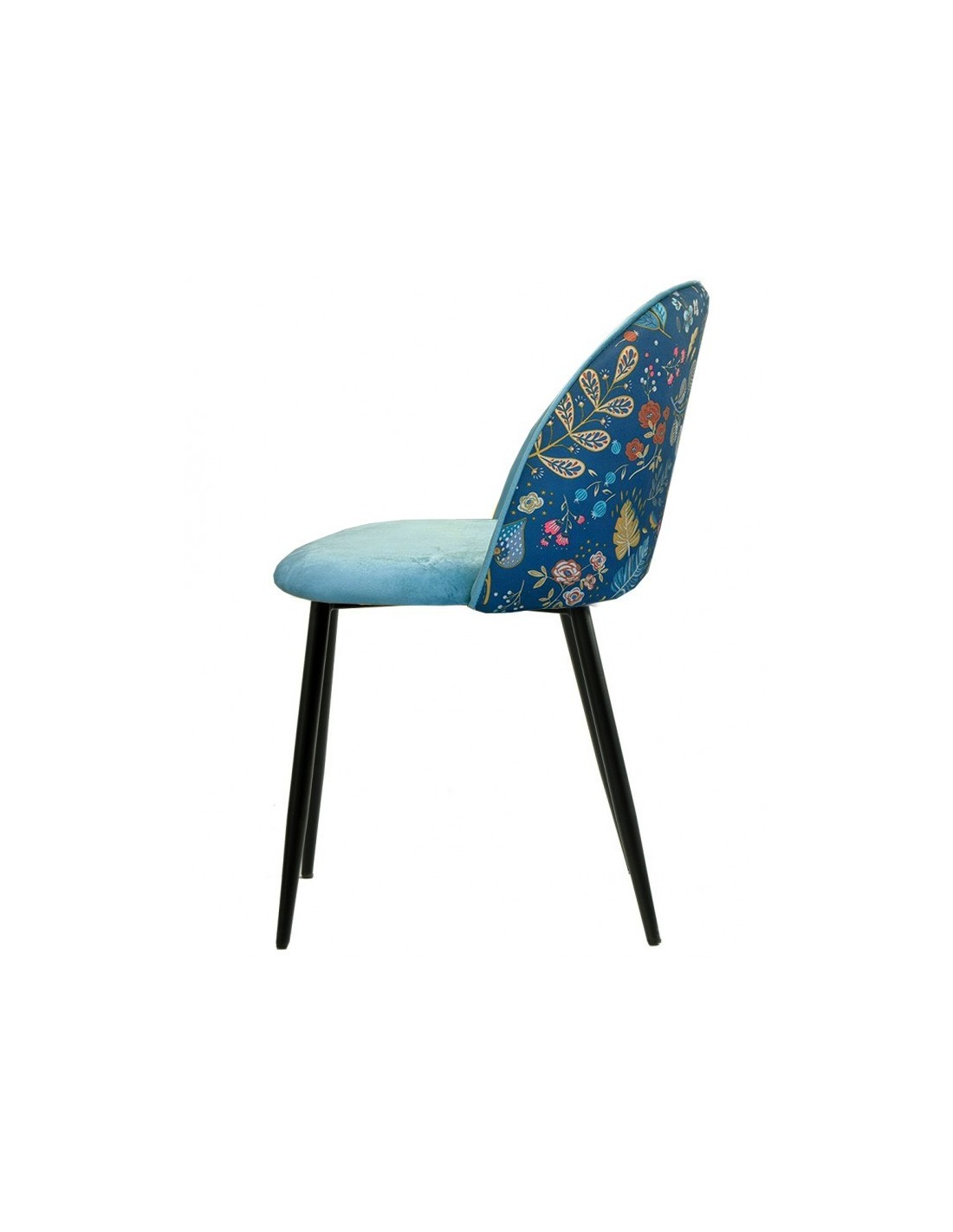 Silla de diseño, armazón metálico con acabado epoxi negro, asiento y respaldo tapizados en terciopelo azul, trasera en tejido decorado carnaval. Otros colores disponibles. Taburete a juego