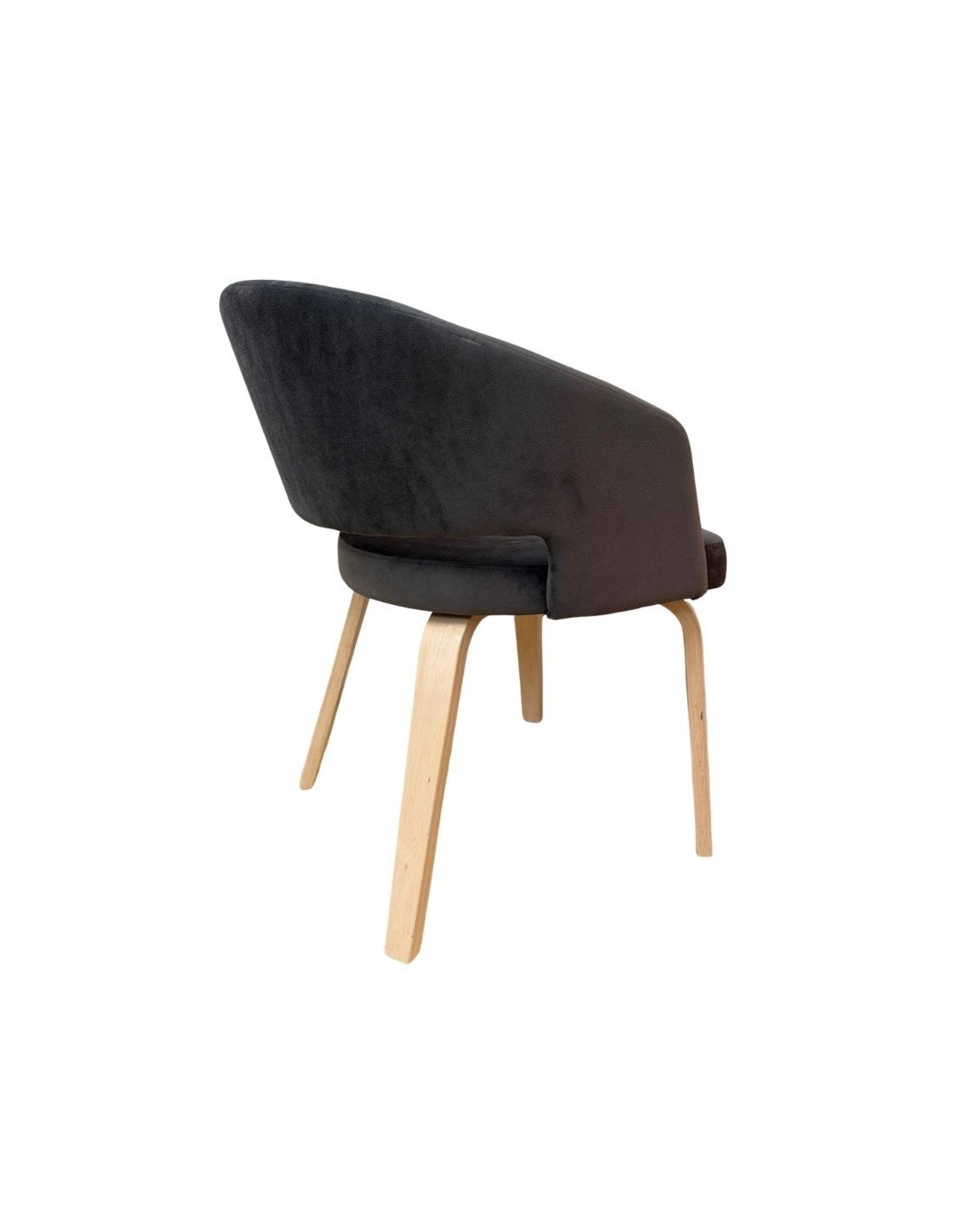 Sillón de diseño, multiusos, contrachapado de madera de hevea, barnizado natural, tapizado velvet gris oscuro. Taburete a juego con el mismo tapizado y acabado