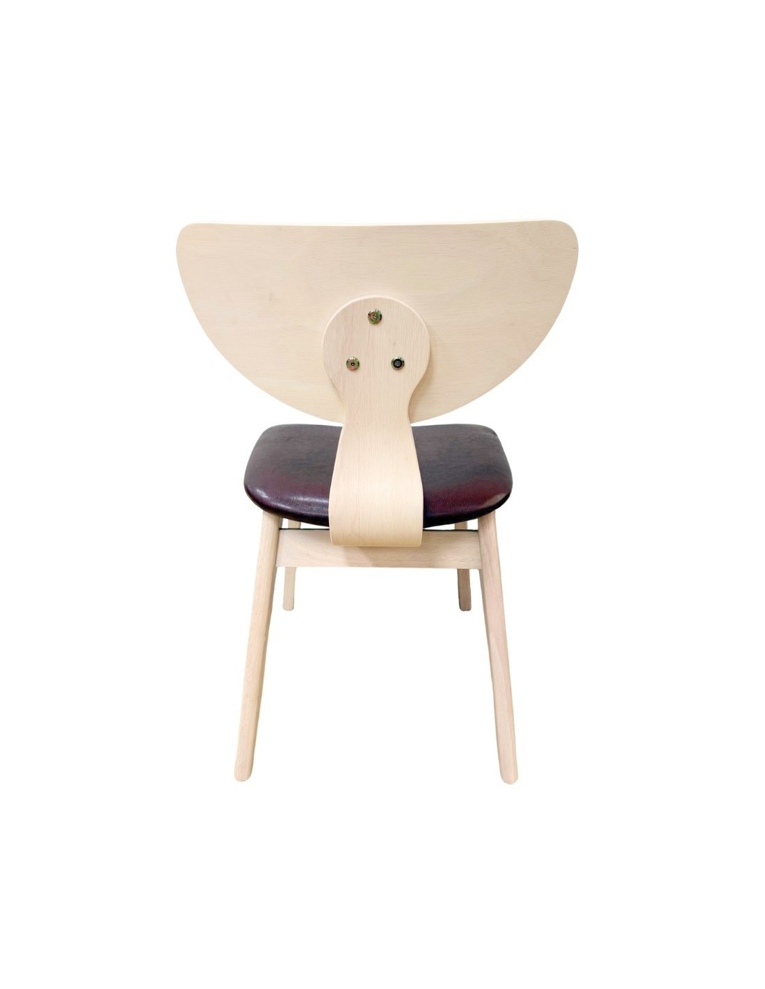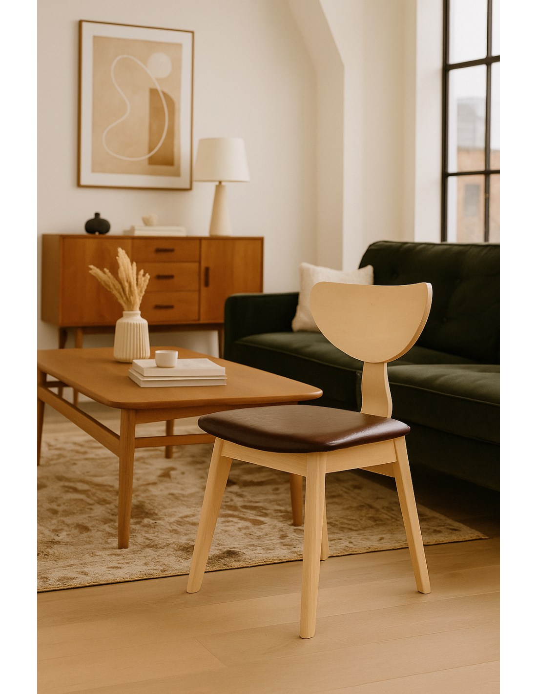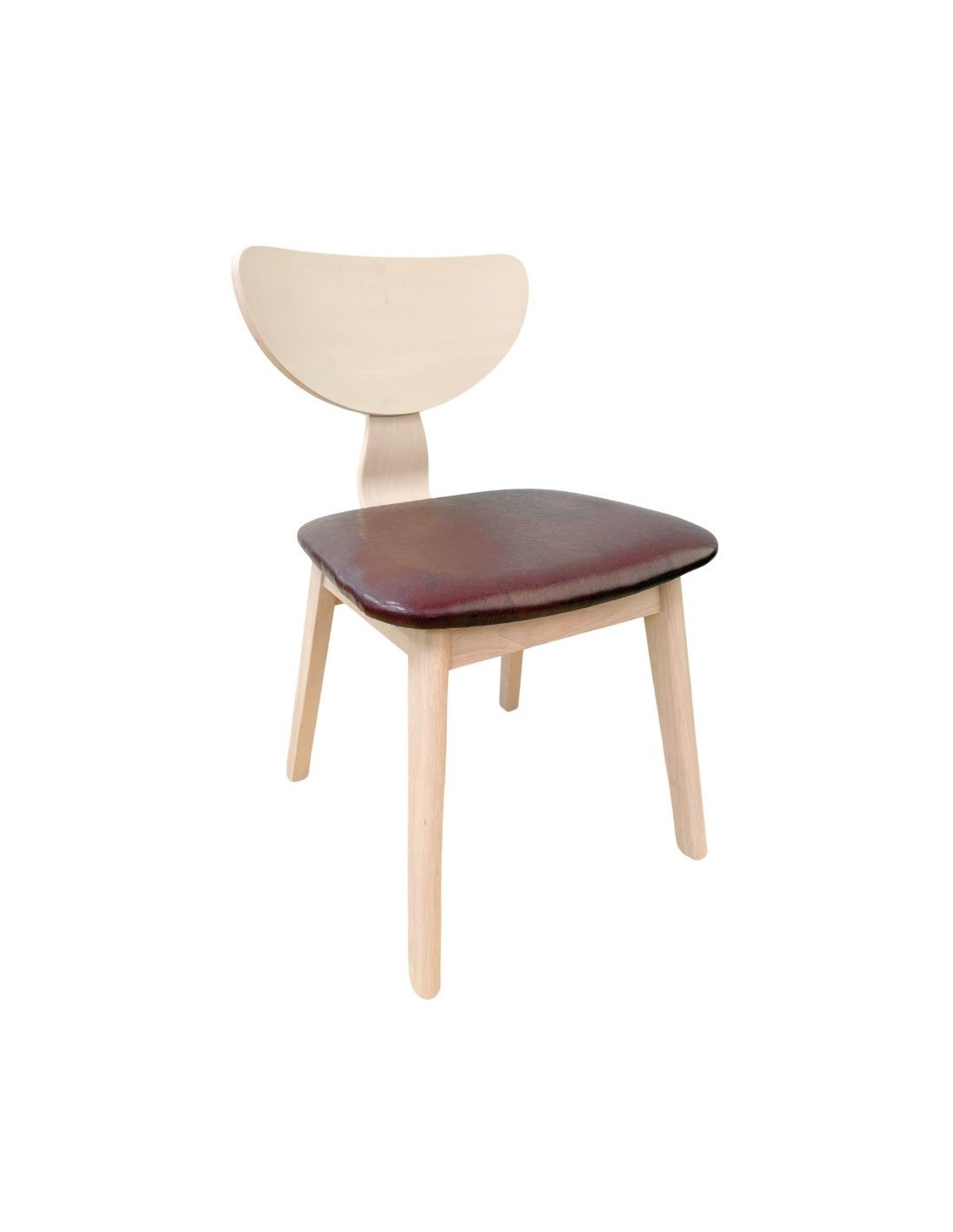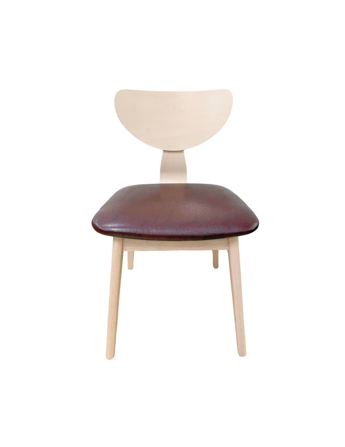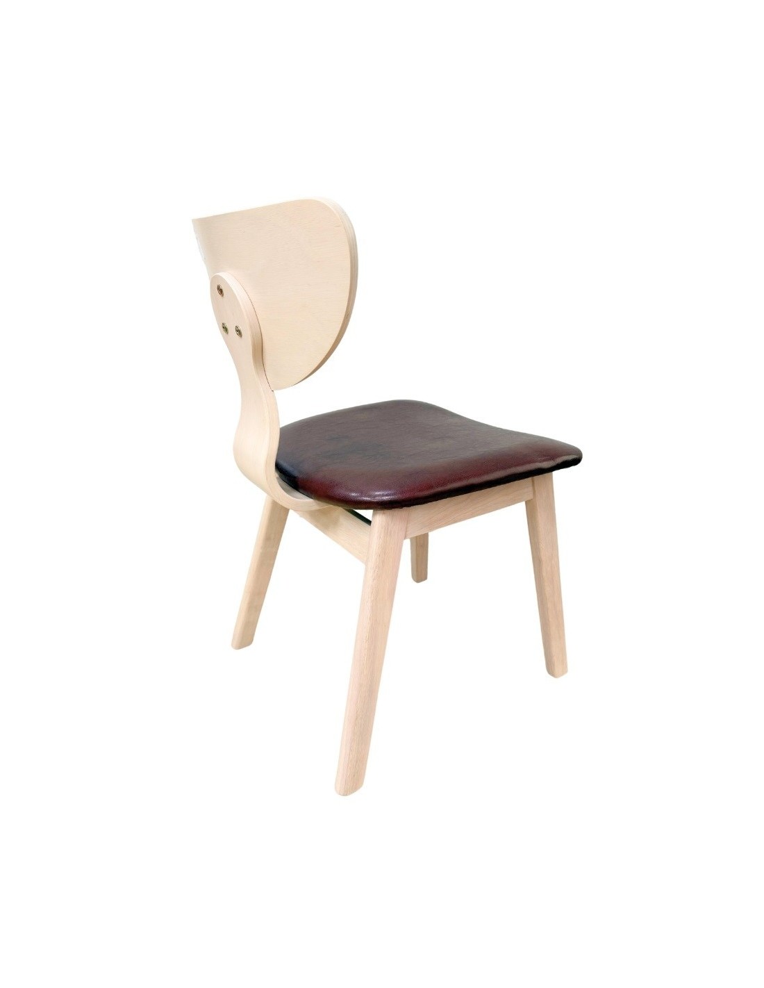Silla de diseño, multiusos, contrachapado de madera de hevea, barnizado natural, similpiel marrón. Taburete a juego