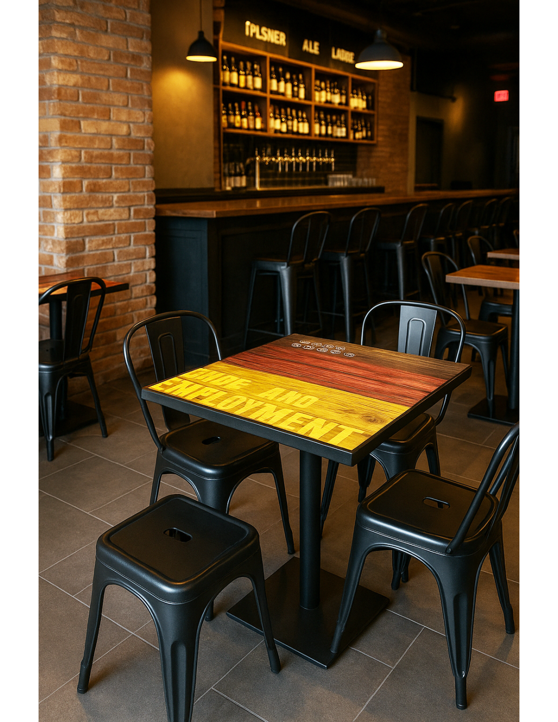 Tablero de mesa vintage, 25 mm de espesor. Formato cuadrado de 60 x 60 cms. Canto de PVC