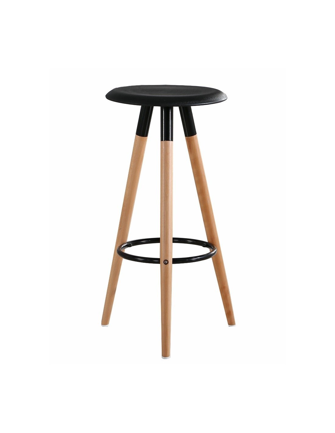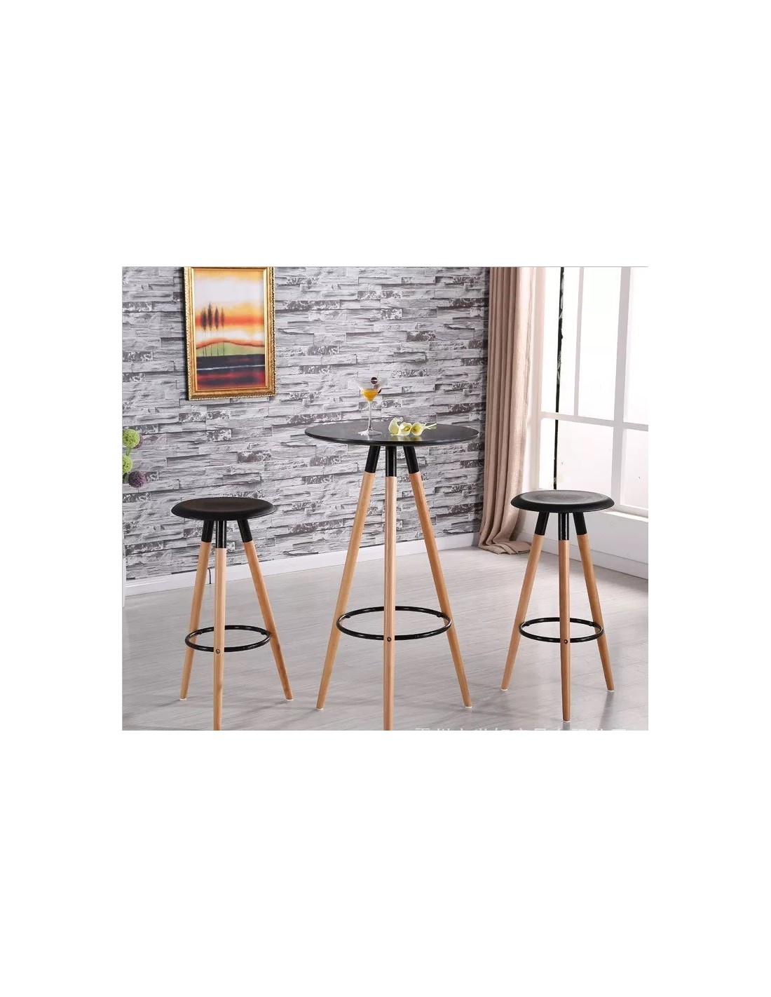 Taburete de diseño, madera, asiento de polipropileno de color negro. Mesa alta a juego.