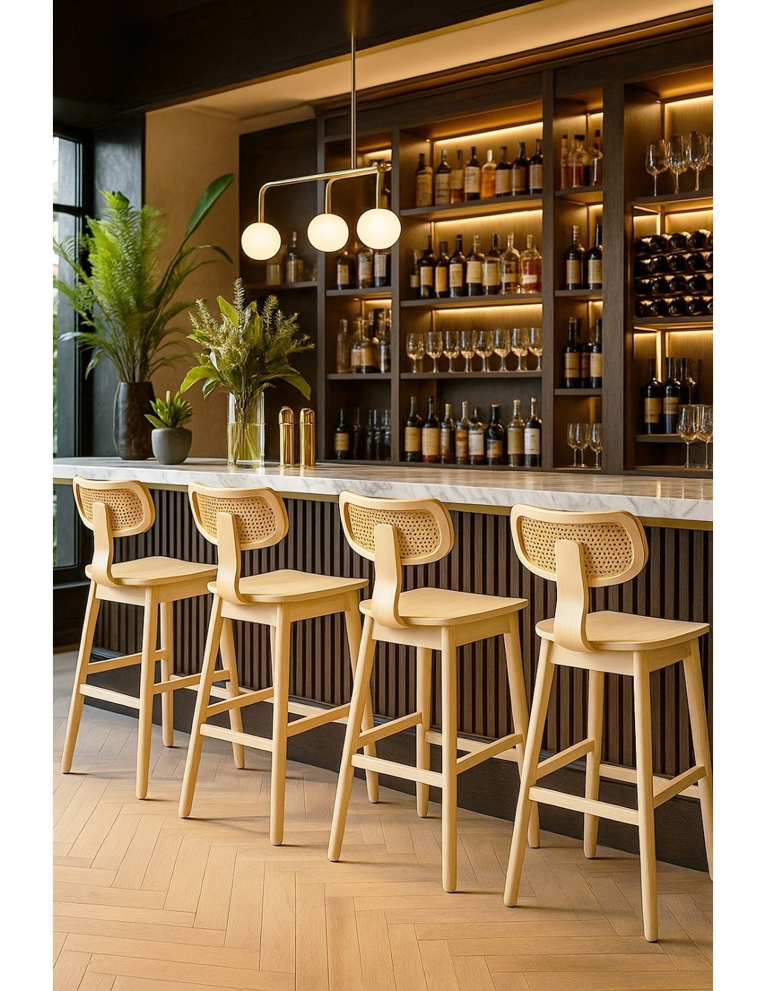 Taburete CORBEL, madera de hevea, rejilla, acabado natural