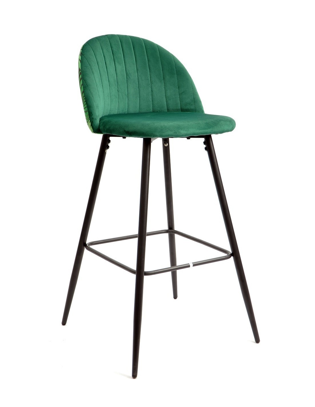 Taburete de diseño, armazón metálico con acabado epoxi negro, asiento y respaldo tapizados en terciopelo verde, trasera en tejido decorado floral a juego. Otros colores disponibles. Silla a juego